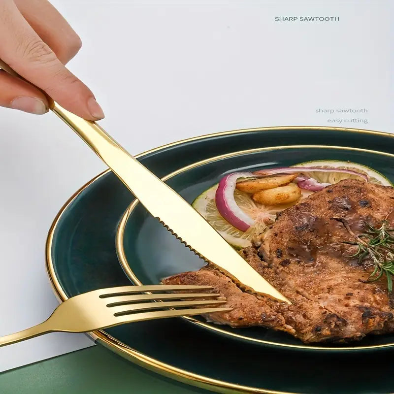 Premium 10pcs steak knife set with gold-plated stainless steel blades. Super sharp, lightweight, and serrated for precise cutting. Perfect for home dining, restaurants, hotels, or outdoor camping. Durable and elegant for every table setting.