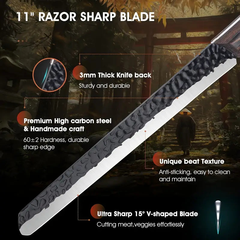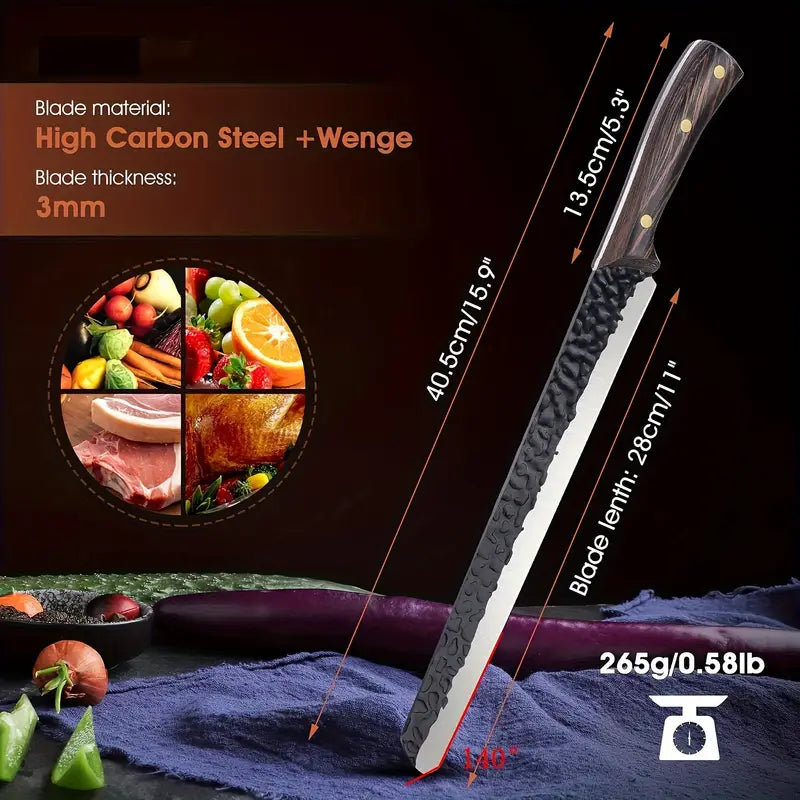 11" Japanese Hand-Forged Brisket & Meat Carving Knife – Full Tang Slicer for Ribs, Roasts, Fruits & Veggies