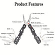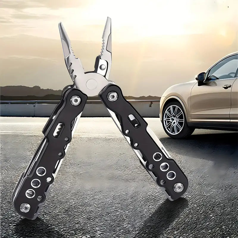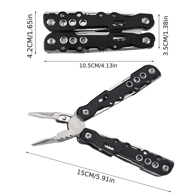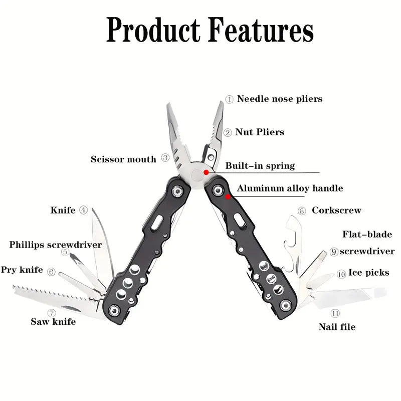 This versatile 12-in-1 multitool pliers is perfect for camping, outdoor activities, and everyday use. Featuring a needle nose, wire cutter, screwdrivers, knife, fish scaler, and bottle opener, this durable tool combines multiple functions into one compact design. It comes with a convenient nylon sheath for easy carrying and storage, making it a must-have for any adventurer or DIY enthusiast.