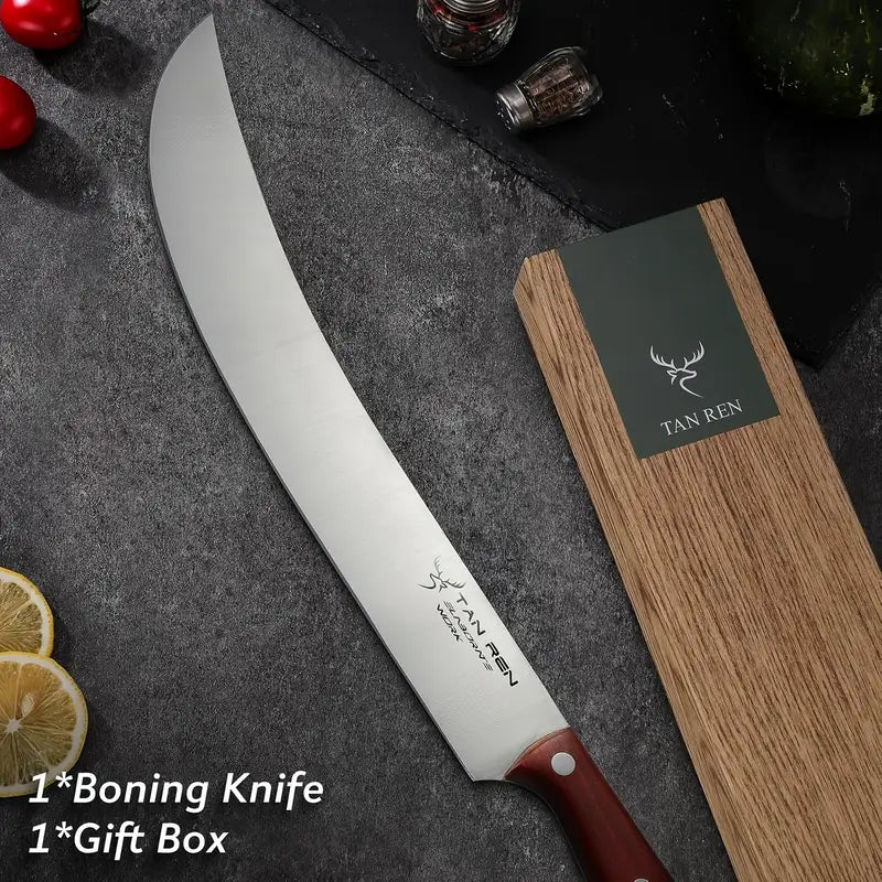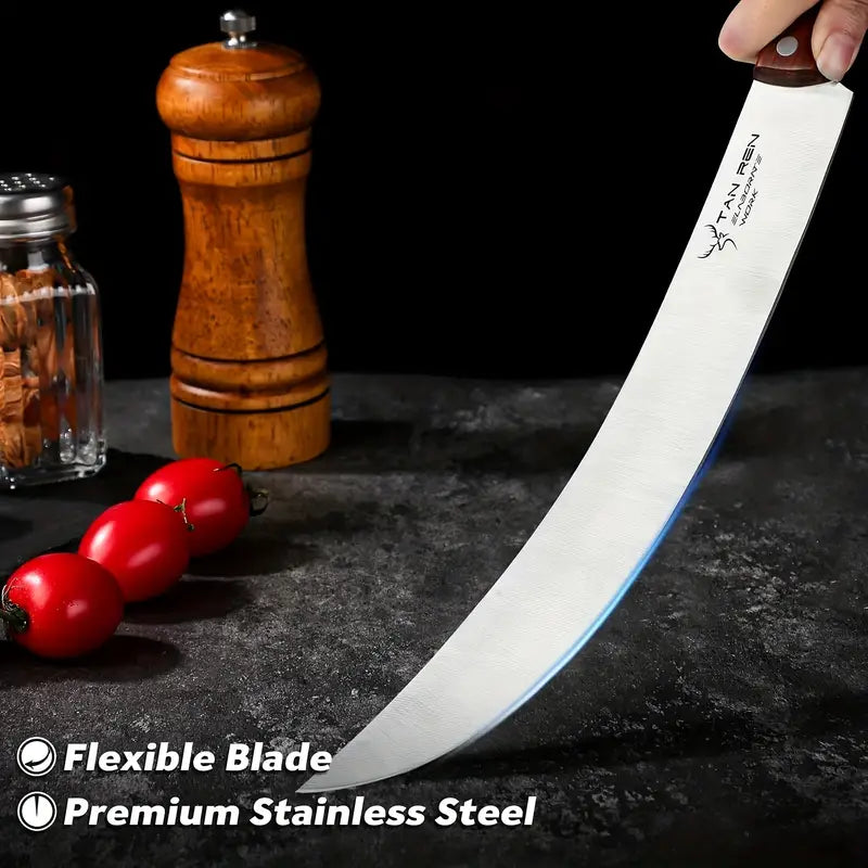 This 12-inch brisket carving knife features a razor-sharp stainless steel blade and full tang design, perfect for slicing brisket, turkey, and other meats with precision. Its sturdy construction makes it ideal for BBQs and festive meals. A great gift idea for men or anyone who enjoys grilling, making it perfect for stocking stuffers.