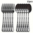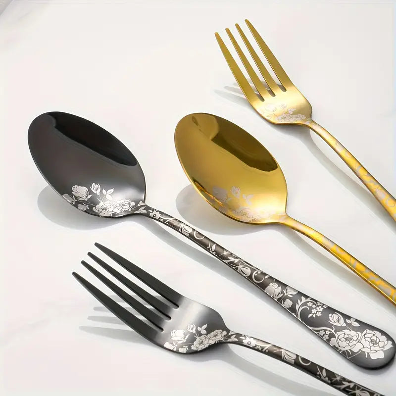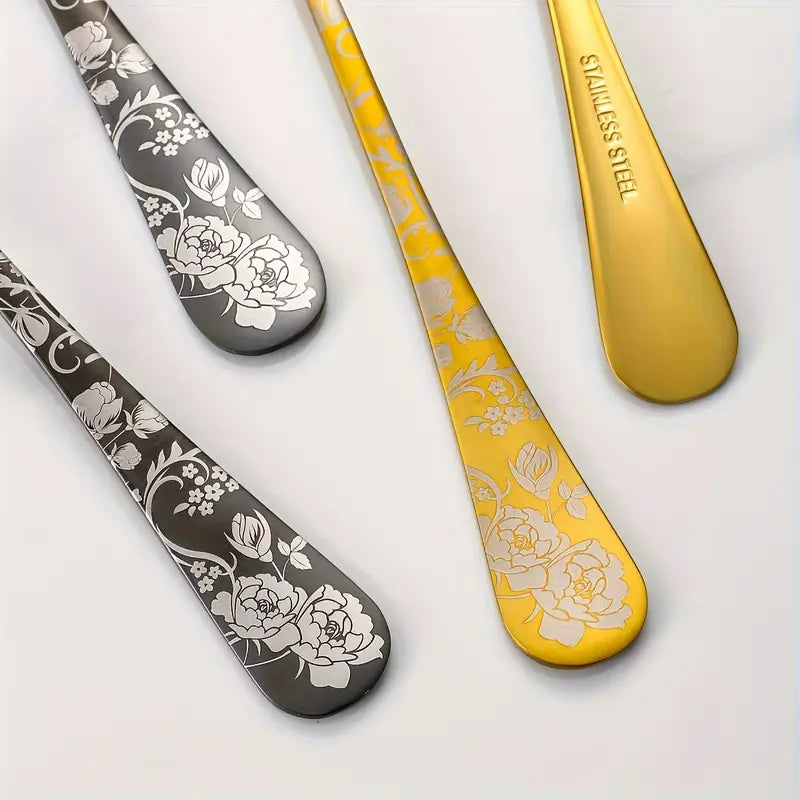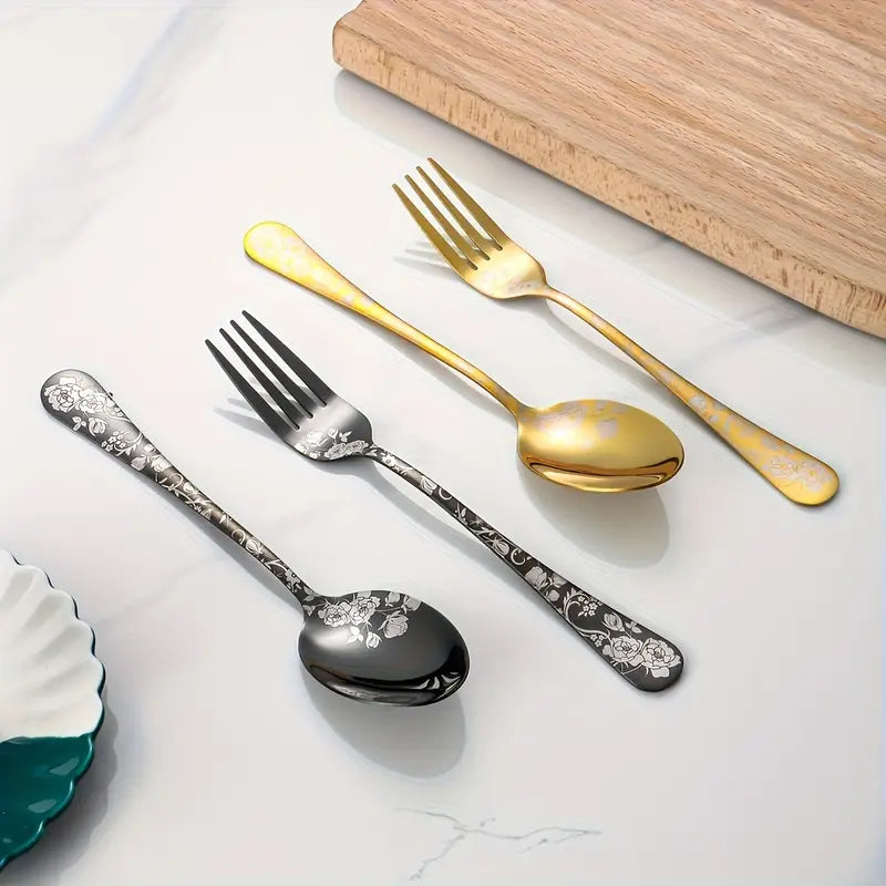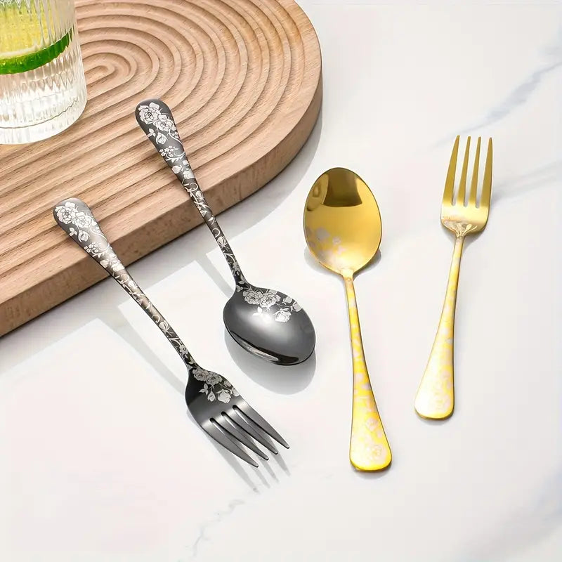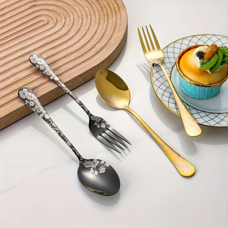 Elevate your dining experience with this premium 12-piece Stainless Steel Fork and Spoon Set. Perfectly designed with laser-printed detailing, these sleek utensils bring both style and durability to any occasion. Crafted from high-quality stainless steel, the set includes dinner forks, spoons, and ice cream scoops, making it ideal for everyday use or special gatherings. Whether it's a cozy family dinner, a Valentine’s Day celebration, a Mother’s Day feast, or a summer party, these utensils are the perfect addition to your kitchen or dining room.