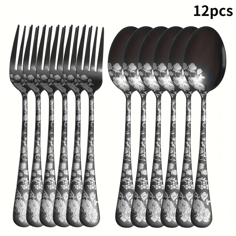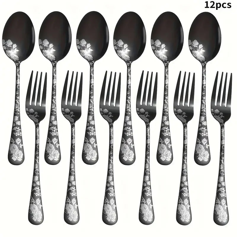 12-Piece Stainless Steel Fork & Spoon Set – Laser Printed Dinnerware for Kitchen, Dining, & Special Occasions