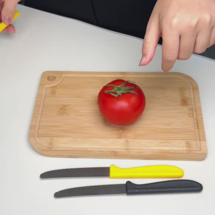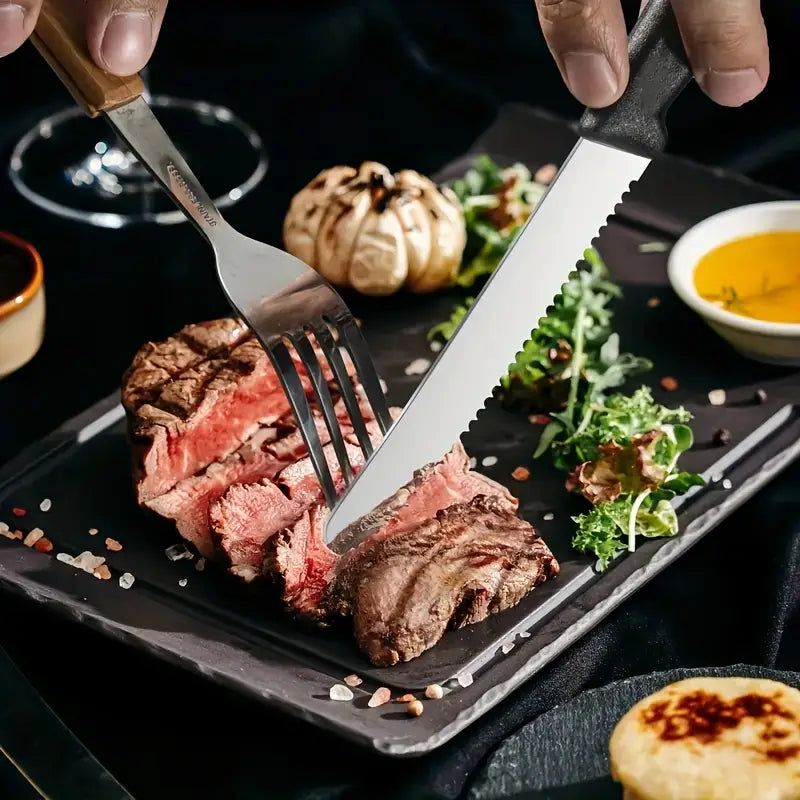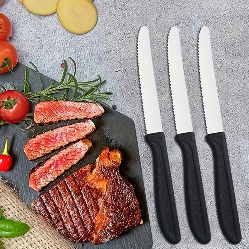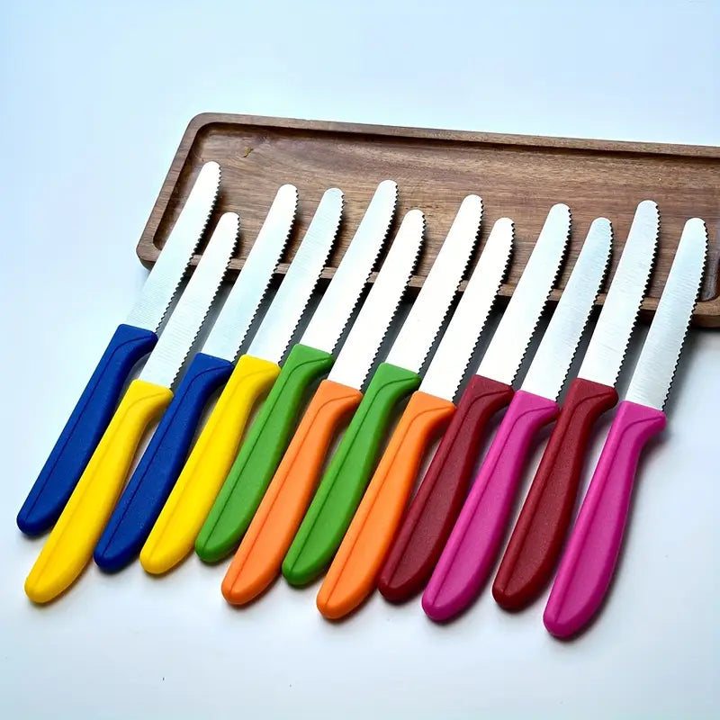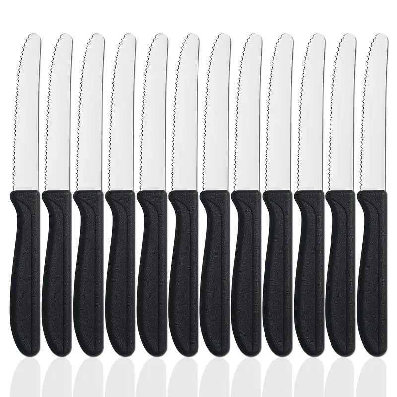 Upgrade your dining experience with this 12-piece stainless steel steak knife set, featuring serrated blades ideal for bread, tomatoes, cheese, and other daily cutting tasks. Each knife has a 4.13-inch blade for precision slicing and is made from durable stainless steel, ensuring long-lasting sharpness. Dishwasher safe and perfect for both home and outdoor use, this multipurpose cutlery set combines functionality, convenience, and style for all your meals.