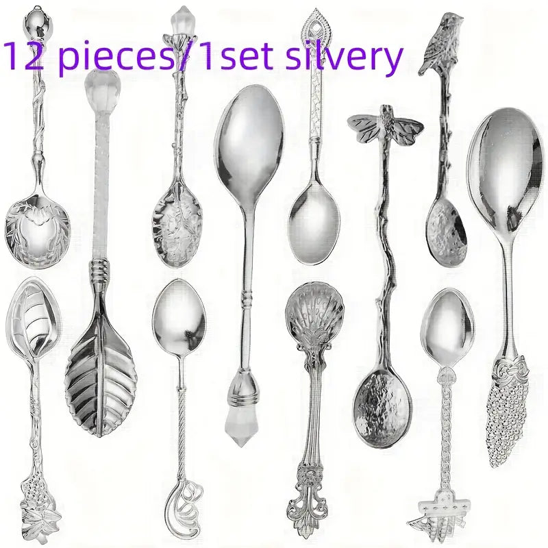 12Pcs Vintage Stainless Steel Coffee & Dessert Spoons – Elegant Boutique Tea, Fruit & Cake Spoons Set