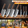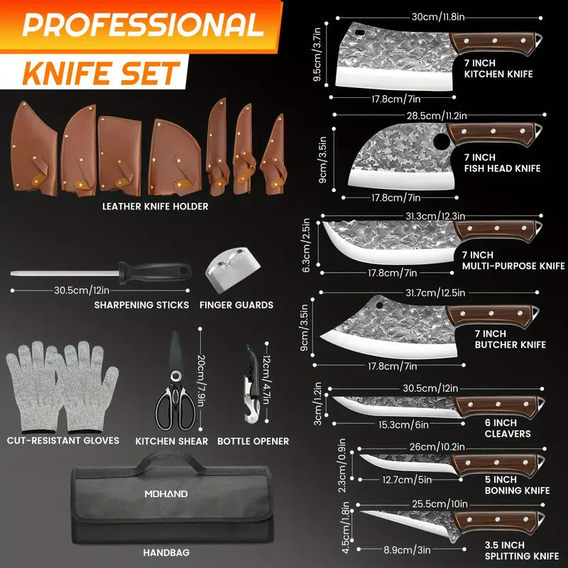 This 14-piece chef knife set is crafted from high carbon steel, featuring a range of essential tools including butcher, boning, carving, and cleaver knives. Hand-forged for durability and precision, the set comes with a convenient roll bag for easy storage and portability, making it ideal for kitchen use, BBQs, and camping. A versatile and complete set for professional chefs and outdoor cooking enthusiasts.