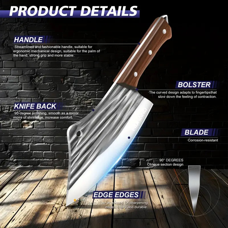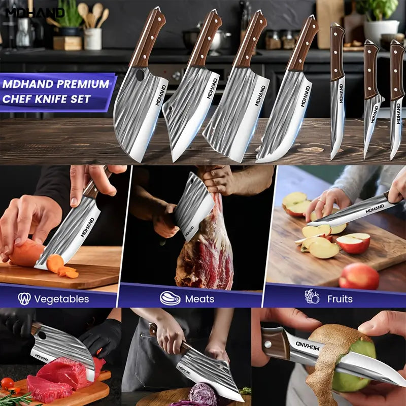 The set includes a variety of essential knives: 3–7 inch chef knives, butcher knife, cleaver, boning knife, utility knife, and splitting knife, ensuring you have the right tool for every kitchen task—from cutting meat to slicing fruits and vegetables.