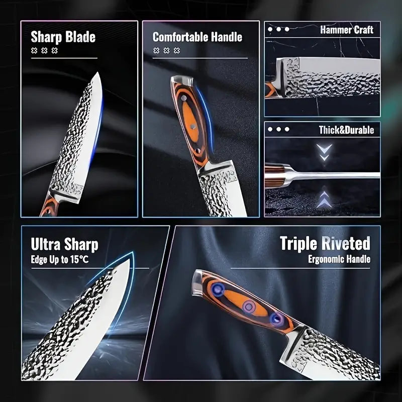 This 15/20-piece professional kitchen knife set features ultra-sharp, medium carbon stainless steel blades that ensure precise cutting for all your culinary needs. The set includes a stylish block for safe storage and a sharpener for easy maintenance. Designed with triple rivet wooden handles for durability and comfort, these knives are dishwasher safe, making cleanup effortless. Perfect for families and a great gift choice for any home chef.