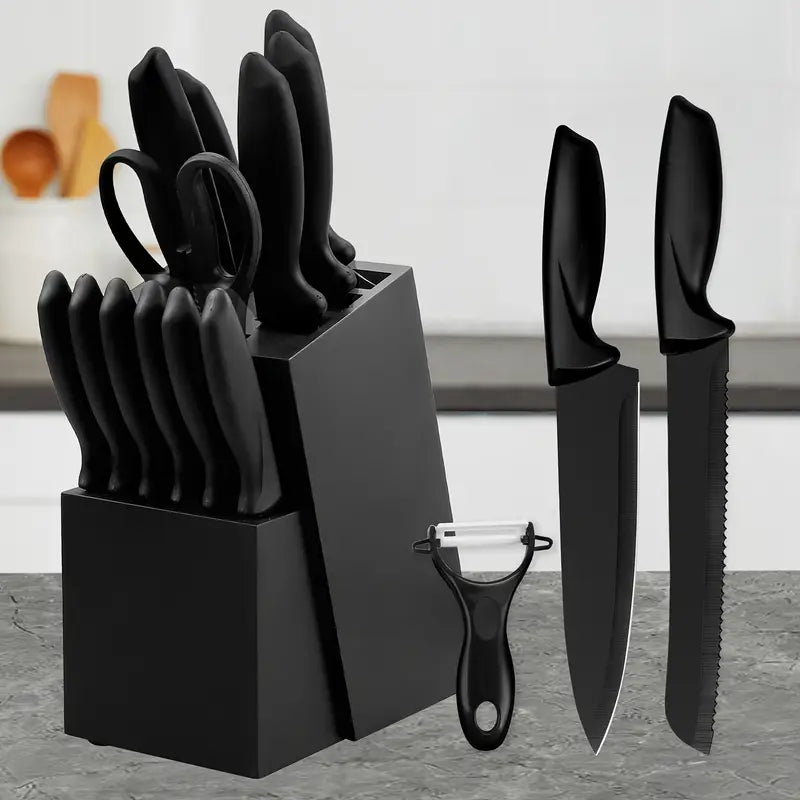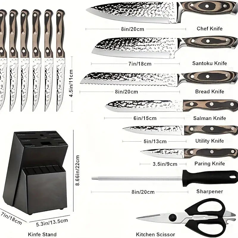 Upgrade your kitchen with this 15-piece knife set, featuring high-quality medium carbon stainless steel blades with a stylish hammered finish. The set includes all essential chef knives, steak knives, and a convenient self-sharpening wooden block for easy storage and maintenance. Perfect for home cooks and professional chefs alike, this knife collection combines durability, precision, and elegance to make every meal prep effortless.