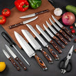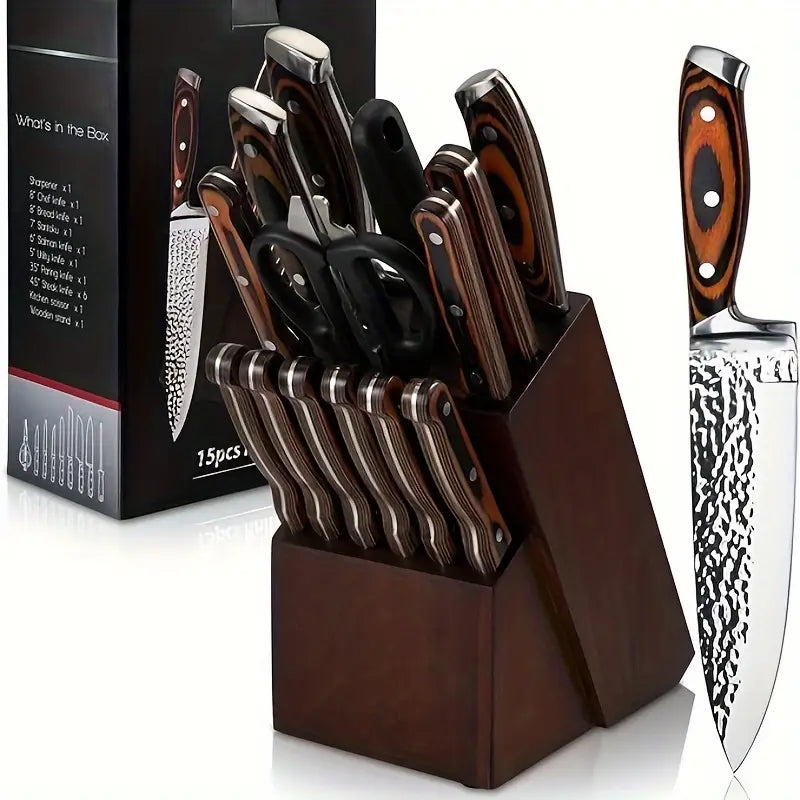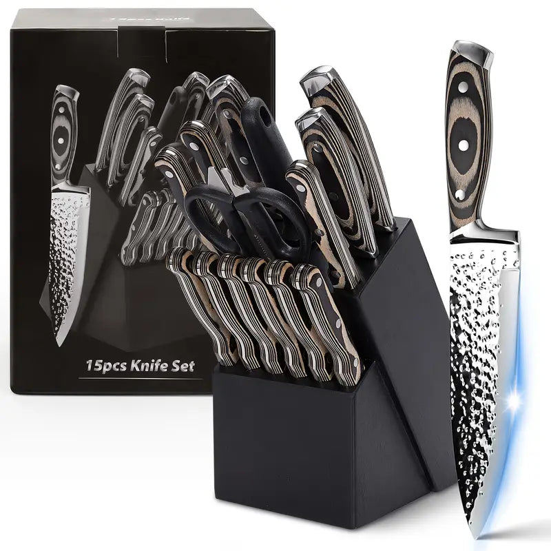 15-Piece Chef Knife Set with Wooden Block – Self-Sharpening Hammered Stainless Steel Knives