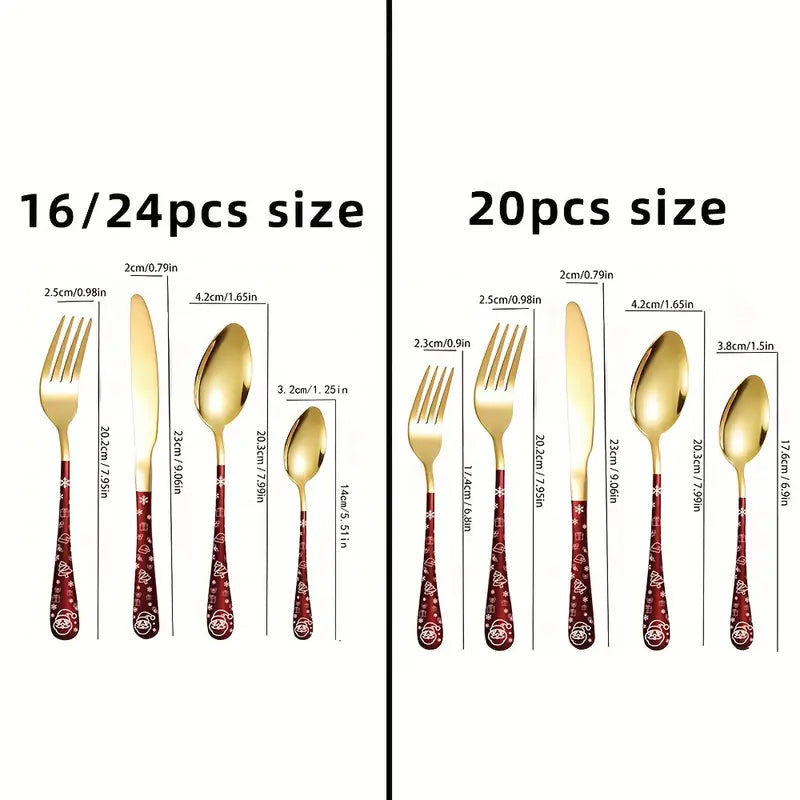 16/20/24pcs Christmas Cutlery Set – Stainless Steel Flatware with Santa & Snowflake Design – Mirror Polished Silverware for Holiday Dining & Festive Tableware Gift Set