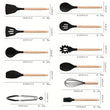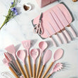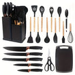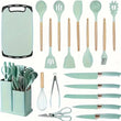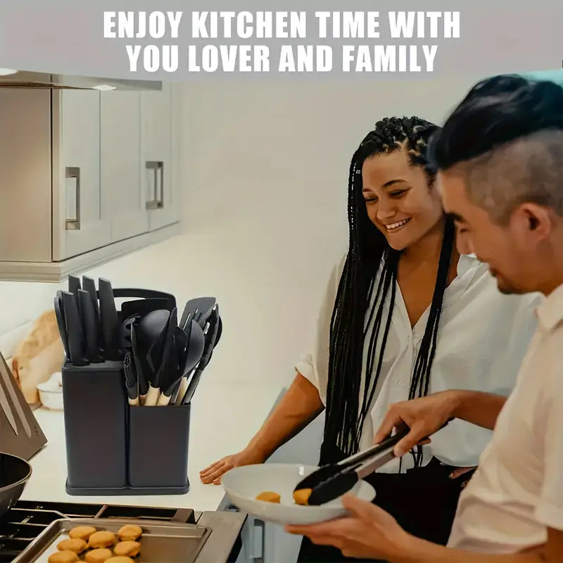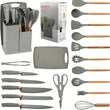 19pcs Silicone Kitchenware & Stainless Steel Knife Set with Wooden Handle Utensils and Storage Bucket