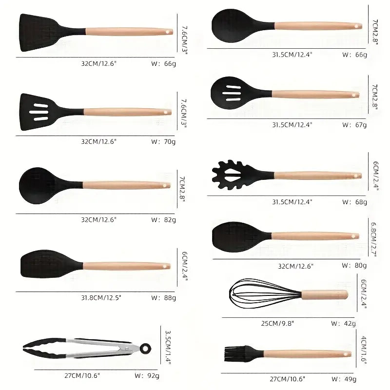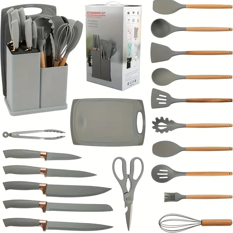 Complete your kitchen with this 19-piece silicone kitchenware and knife set, designed for durability and style. The set includes stainless steel knives, wooden handle spoons, shovels, and cooking tools, all neatly organized in a practical storage bucket. Heat-resistant silicone ensures safe cooking, while the ergonomic wooden handles provide comfort and elegance. A versatile kitchen essential set, perfect for everyday family meals, special occasions, or gifting.