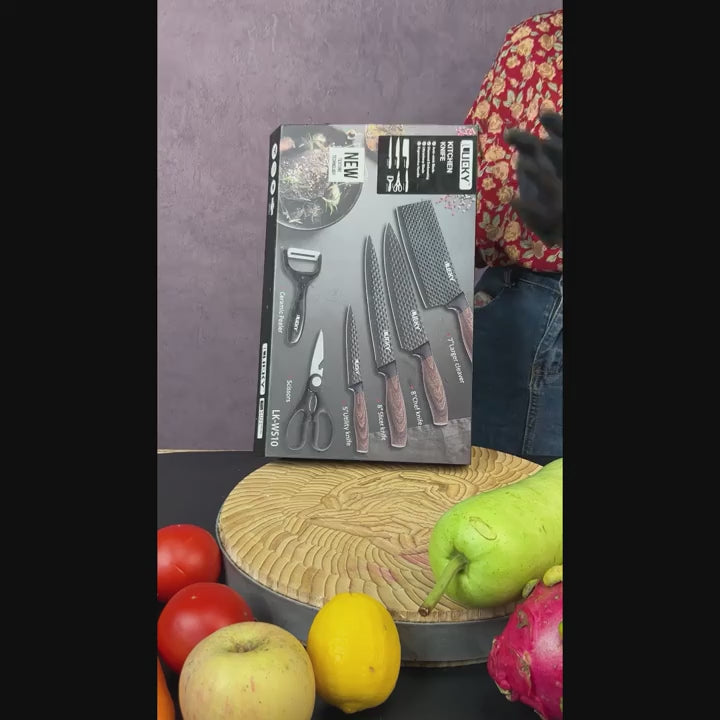 This 1- or 6-piece kitchen knife set includes chef knives, slicing knives, scrapers, and scissors, all crafted from sharp stainless steel for precise cutting. Featuring ergonomic wooden handles for comfort and control, the set comes in a stylish gift box, making it perfect for home cooking, family use, and gifting. Durable, versatile, and practical, this knife set is a must-have for any kitchen.