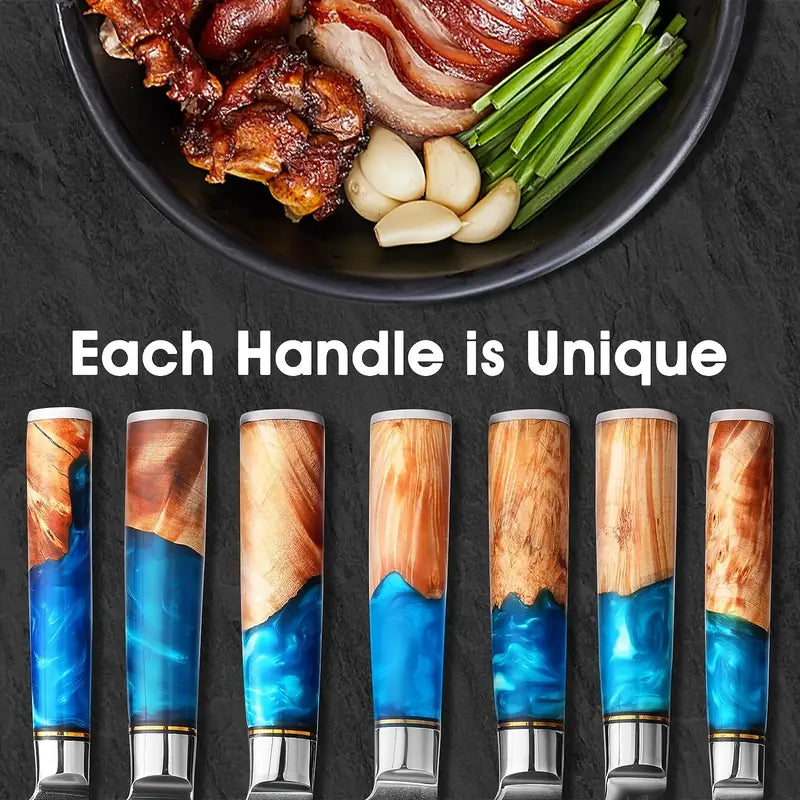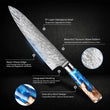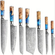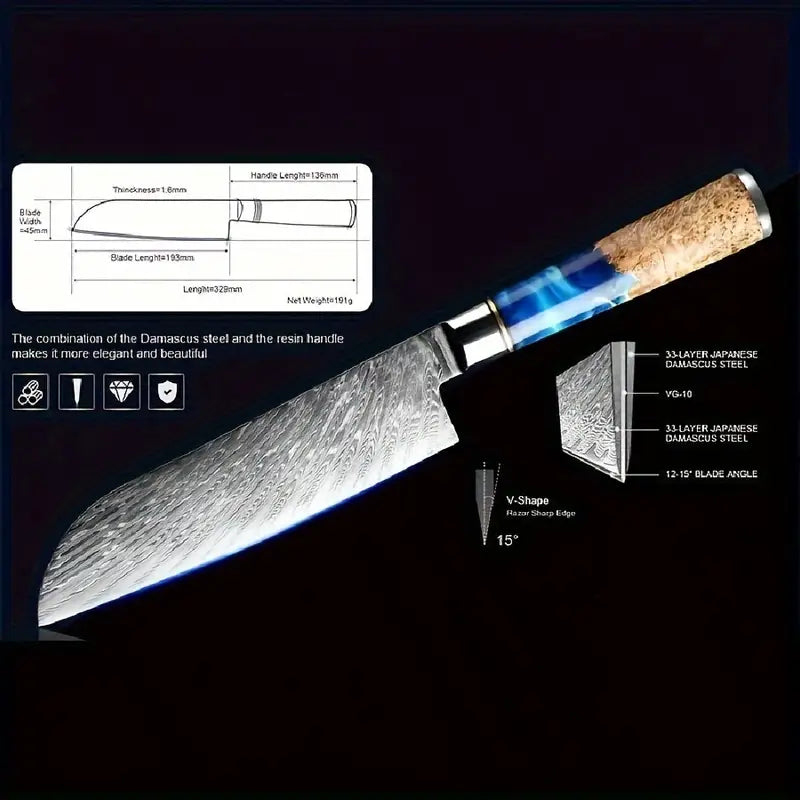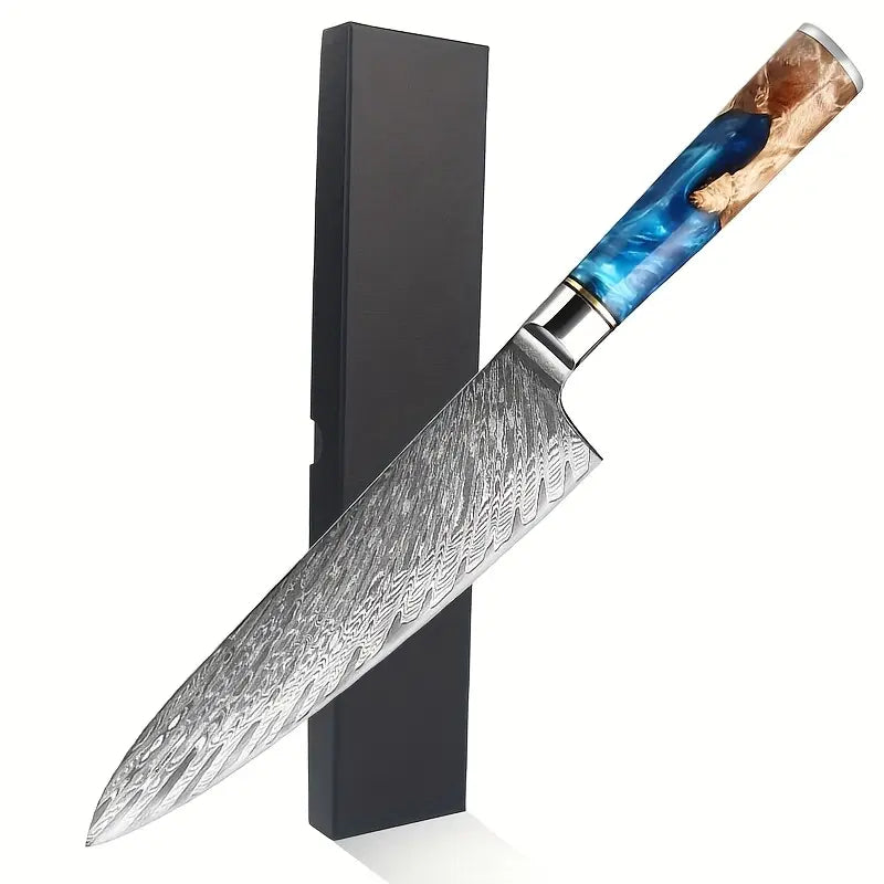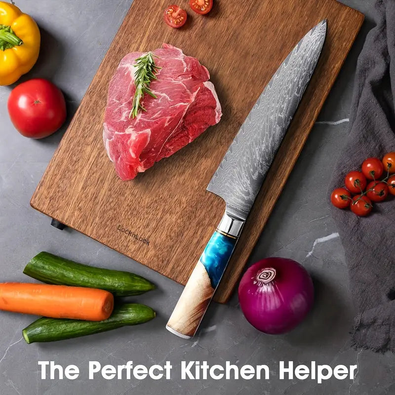 Crafted with a VG10 steel core and 67-layer Damascus steel, this professional kitchen knife offers exceptional sharpness and durability. The high-carbon blade paired with a comfortable resin handle makes chopping, slicing, and dicing effortless. Perfect for chefs and home cooks alike, this versatile set includes Chef, Santoku, Bread, and Utility knives for all your culinary needs.