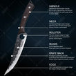This stainless steel boning knife features a sharp, handmade forged blade with a protective sheath, perfect for precise cutting of fruit, vegetables, fish, and meat. Versatile and durable, it serves as a professional chef knife, multipurpose utility knife, or peeling and cleaving tool, making it an essential addition to any kitchen for cooking and barbecue tasks.