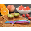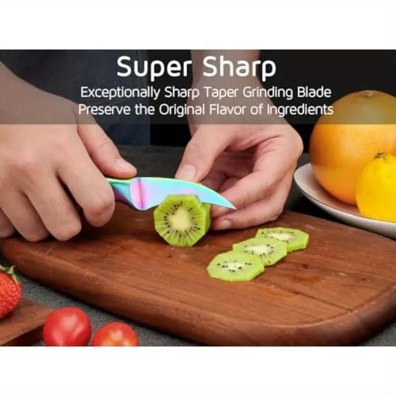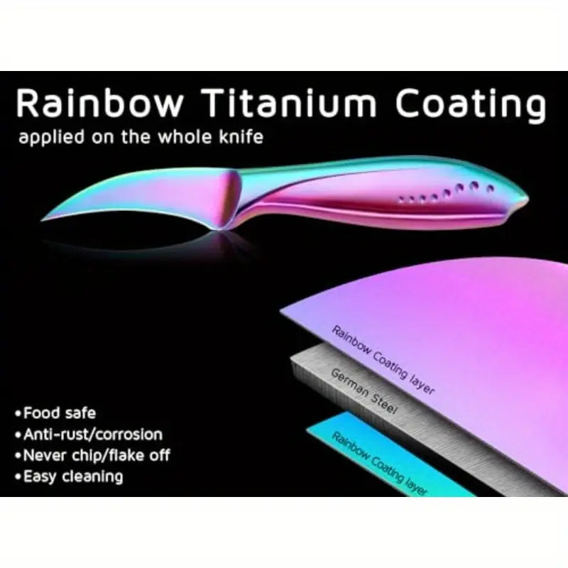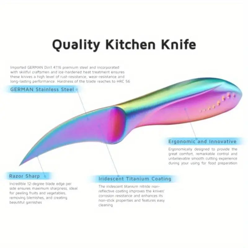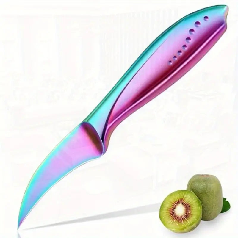 This 2.5-inch Birds Beak Knife features a high-carbon stainless steel blade with a stunning rainbow gradient curve, designed for precise peeling, garnishing, and cutting of fruits and vegetables. Its ergonomic handle ensures a comfortable, secure grip, making it an ideal kitchen tool for effortless fruit preparation and enhancing the freshness and flavor of your dishes. Durable and visually striking, this knife adds both functionality and vibrant style to your kitchen.