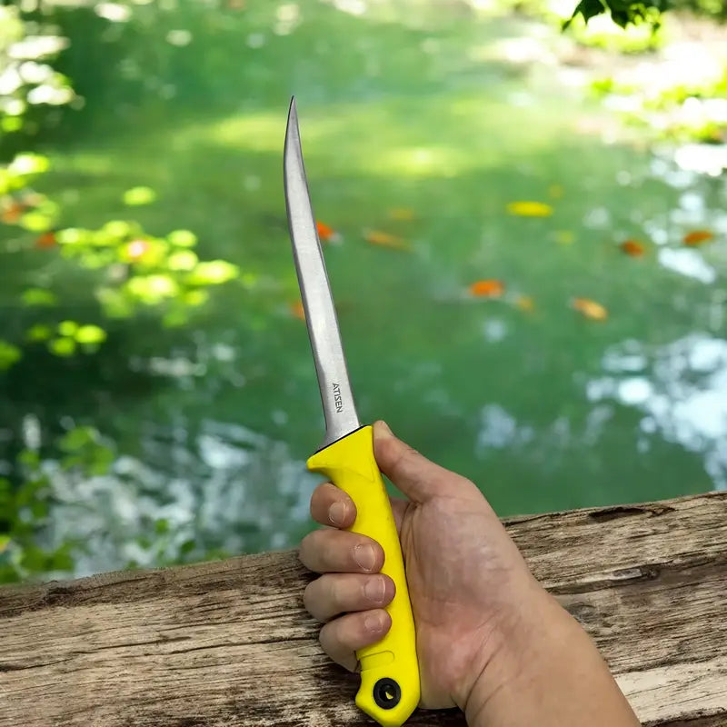 This 2-piece 9-inch yellow knife set includes a high-quality fish and boning knife, a knife sharpener, and a towel, making it perfect for easy slicing of meat and maintaining sharp edges. Crafted from durable stainless steel, these knives are designed for precision and efficiency in the kitchen. Ideal for Christmas gifts for parents and relatives, this set brings both style and practicality to any culinary space.