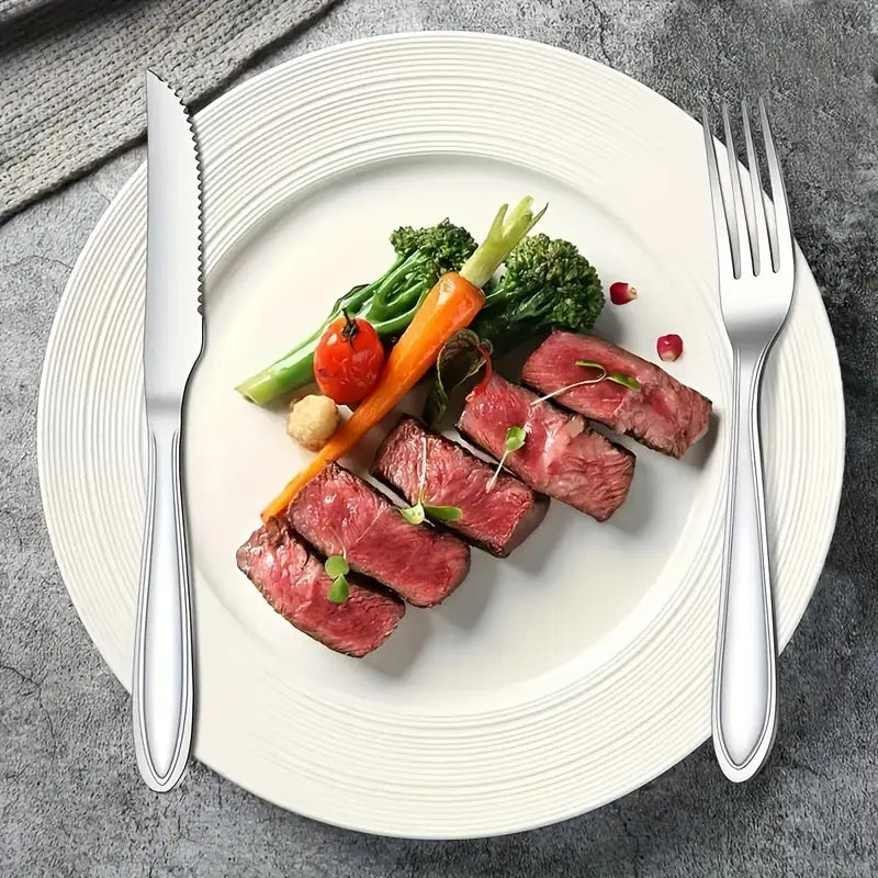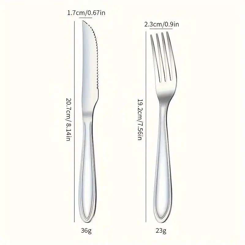 Elevate your dining experience with this 20-piece stainless steel flatware set, including 10 knives and 10 forks. Crafted from high-quality stainless steel with a mirror-polished finish, this set combines elegance and durability for everyday meals or special occasions. Perfect for home dining, family gatherings, and professional restaurant use. Sleek, long-lasting, and easy to clean, it’s an essential addition to any table setting.