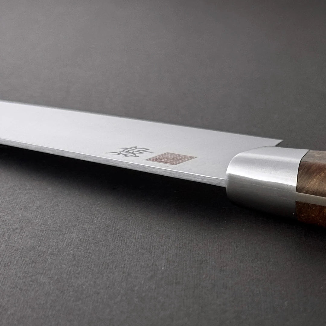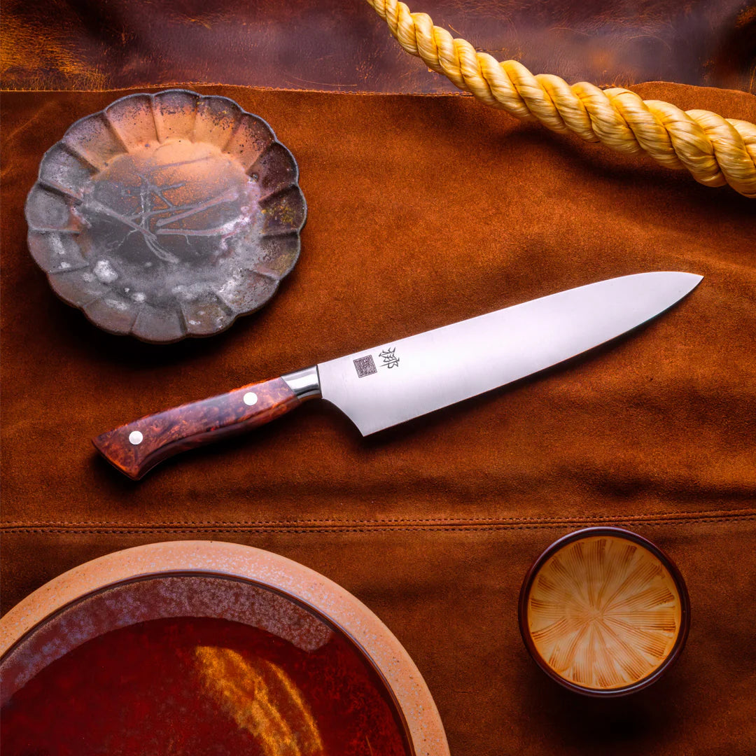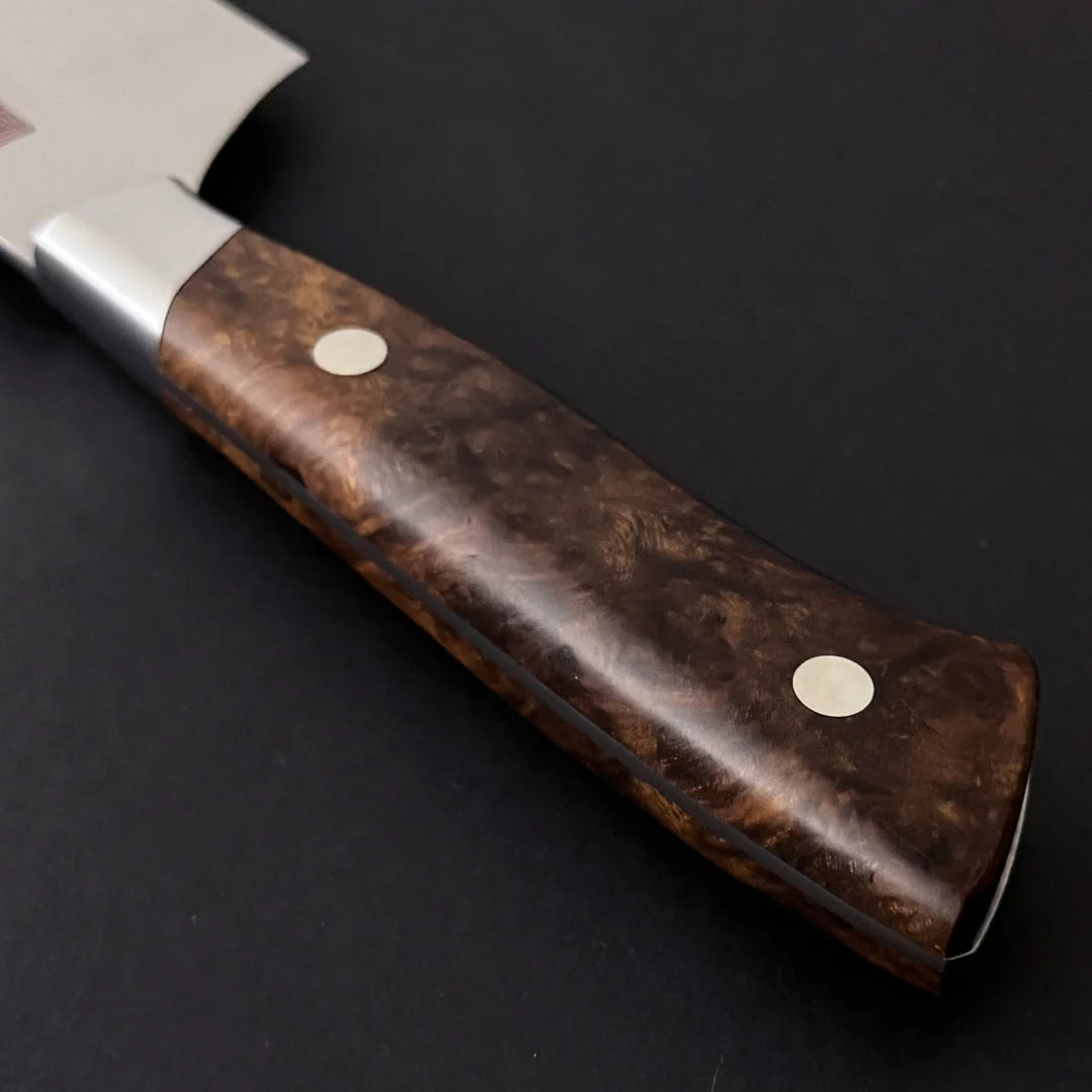 This beautifully crafted 210mm knife features a rich Desert Ironwood handle, offering both elegance and durability. It comes with a matching Saya cover for safe storage and easy portability, making it a perfect addition for collectors, chefs, or outdoor enthusiasts seeking style and functionality in one.