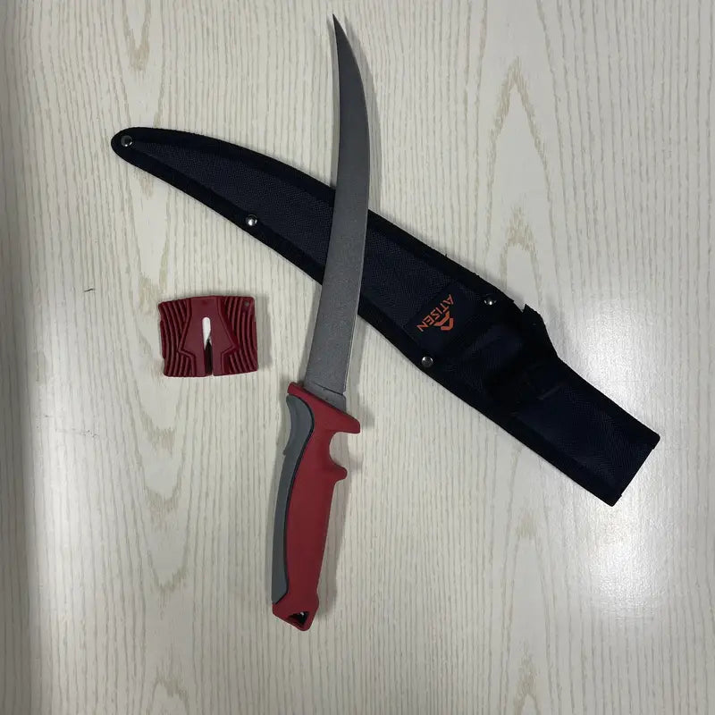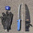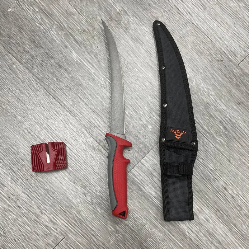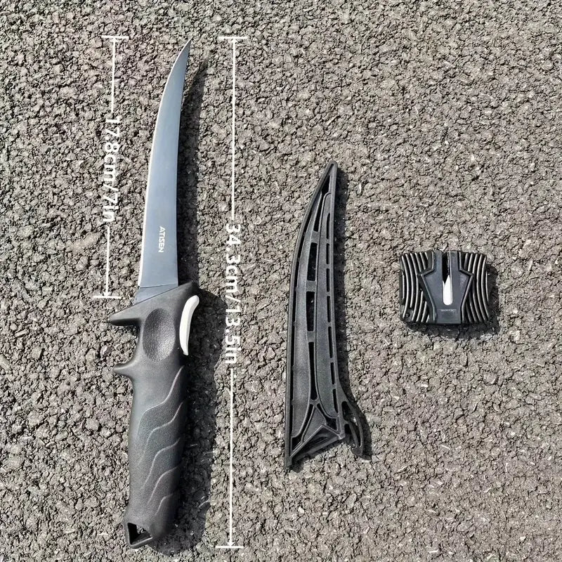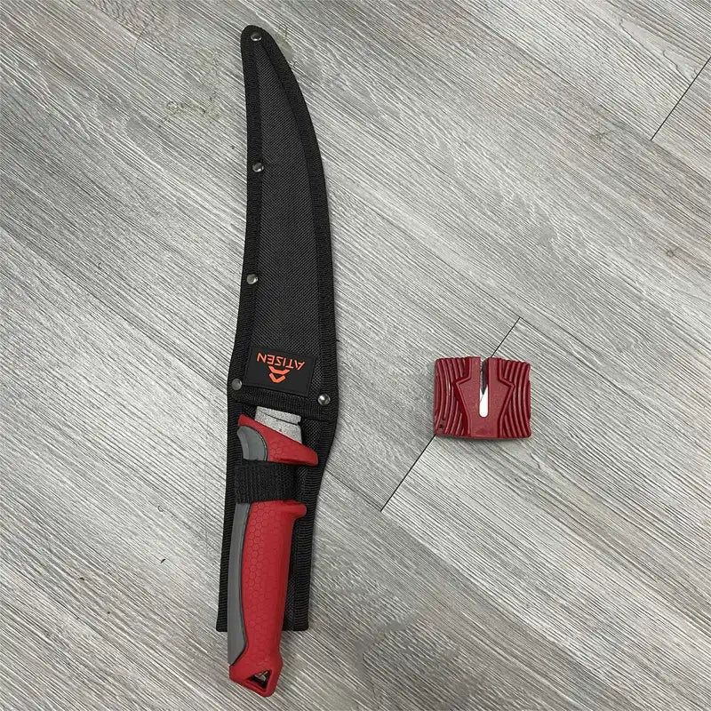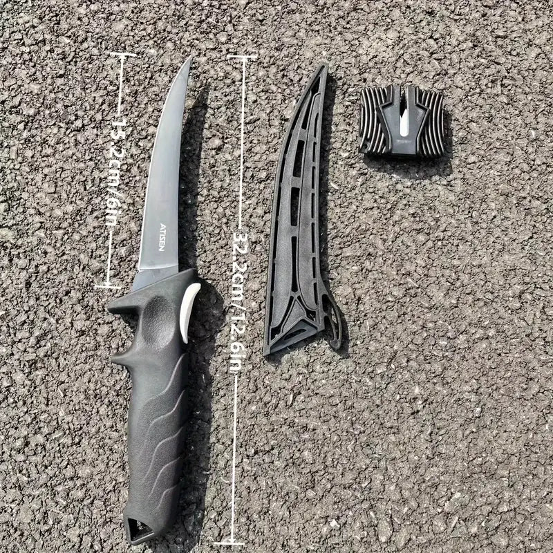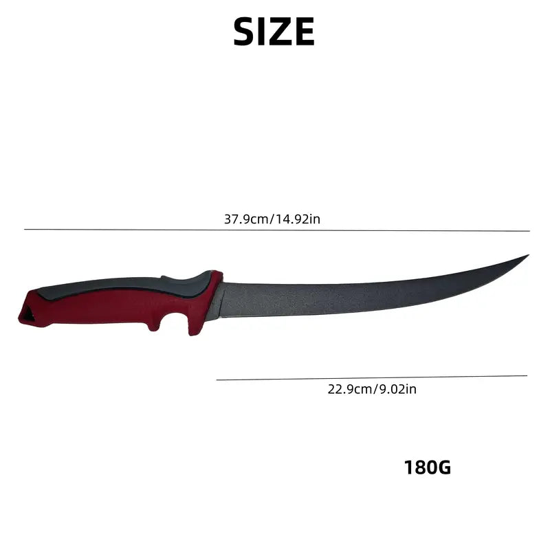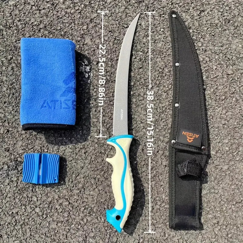 This 2-piece 14.9" Outdoor Fishing Knife Set includes a 9" sharp stainless steel blade, a professional fillet and boning knife, and a handy knife sharpener. Featuring a non-slip handle for secure grip and a protective sheath for safe storage, it's the perfect gift for dad, offering everything needed for fishing, prepping, and outdoor adventures.