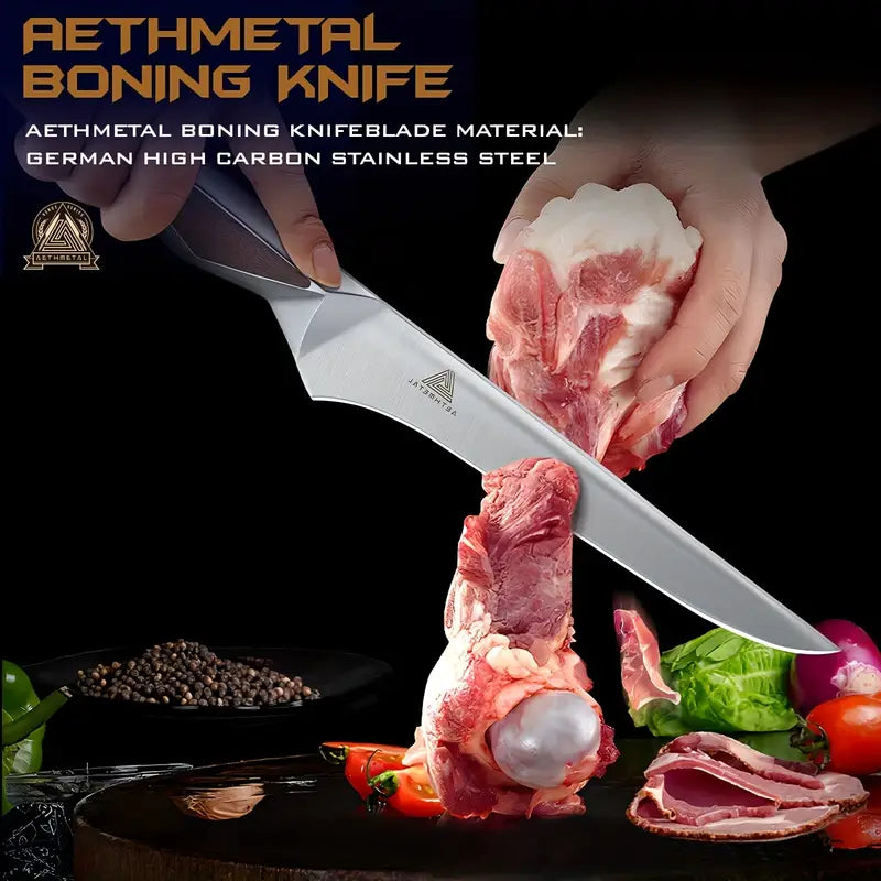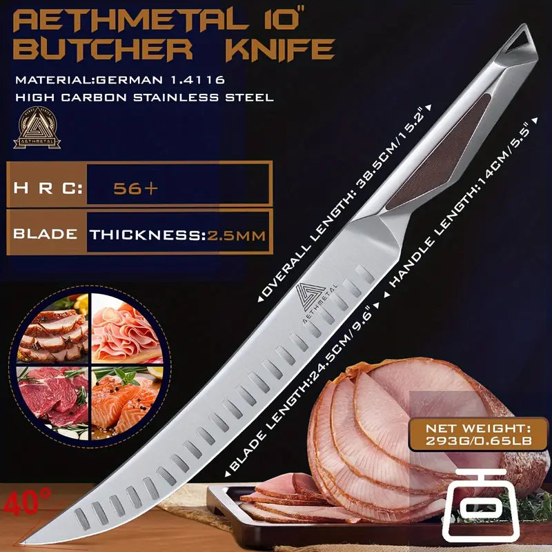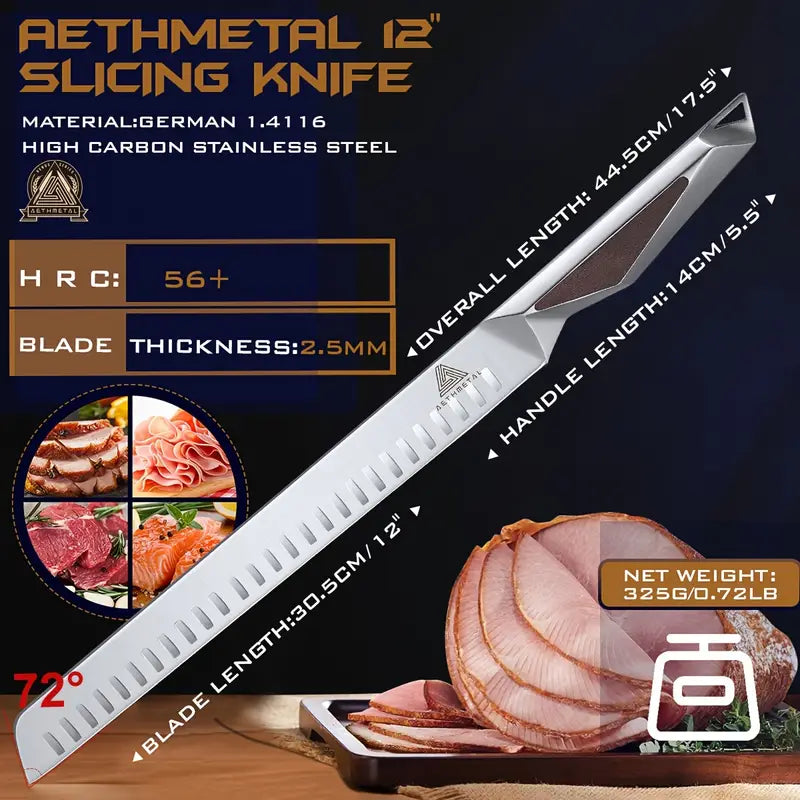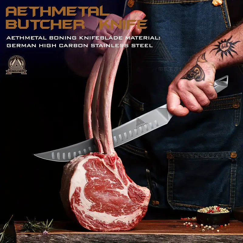 This 3-piece slicing and carving knife set includes a 10" breaking knife, 12" brisket knife, and 6.5" fillet knife, all designed for effortless meat cutting and BBQ tasks. Crafted with premium German steel, these knives feature ergonomic full tang handles for ultimate control and comfort. Packaged in an elegant gift box, this set makes the perfect grilling gift for men, ideal for both professional chefs and BBQ enthusiasts.