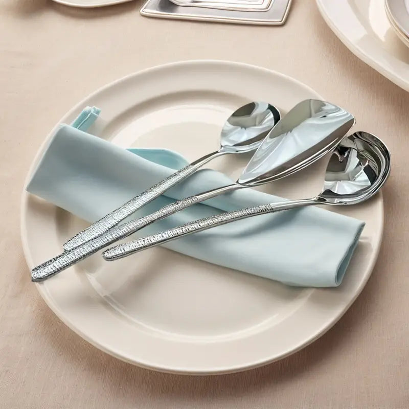 Upgrade your dining and cooking experience with our 3-Piece Thickened Stainless Steel Serving Spoon Set, designed for both style and functionality. Crafted from high-quality stainless steel, each piece features a hammered and mountain rock texture, offering a luxurious, modern aesthetic that complements any kitchen.