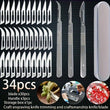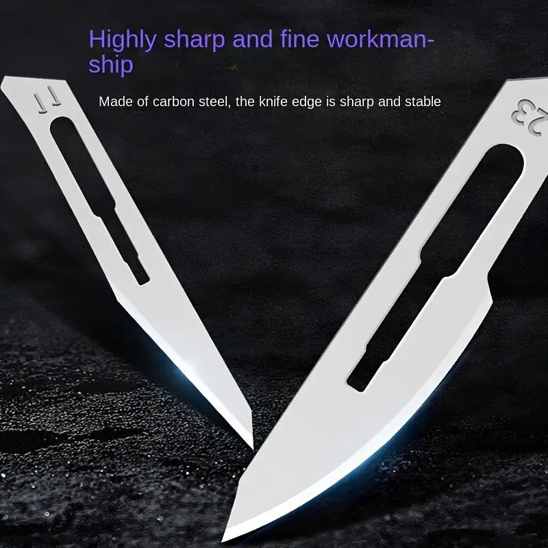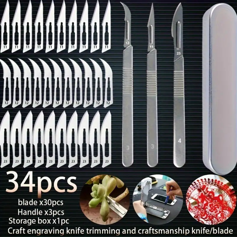 This 34-piece precision carving set includes 3 sturdy handles and 30 carbon steel blades in assorted shapes (#11 pointed, #12 crescent, #23 round head), neatly packed in a durable iron storage box. Ideal for carving, product repair, DIY crafts, clay modeling, plant grafting, car film application, and trimming industrial plastics, this versatile knife set ensures accuracy, durability, and convenience for hobbyists and professionals alike.