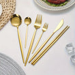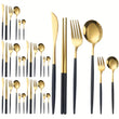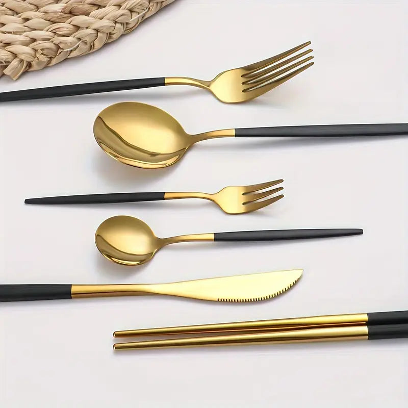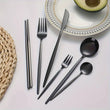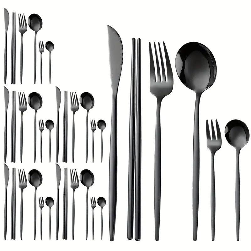 Elevate your dining experience with our 36-Piece Elegant Stainless Steel Cutlery Set, featuring a sleek and modern design with striking black handles. This set includes everything you need for a sophisticated meal: steak knives, dinner forks, spoons, dessert spoons, coffee spoon, and even chopsticks, making it the perfect choice for any occasion. Whether you're hosting a dinner party, wedding, or simply enjoying a meal at home, this cutlery set adds a touch of luxury to your table.