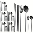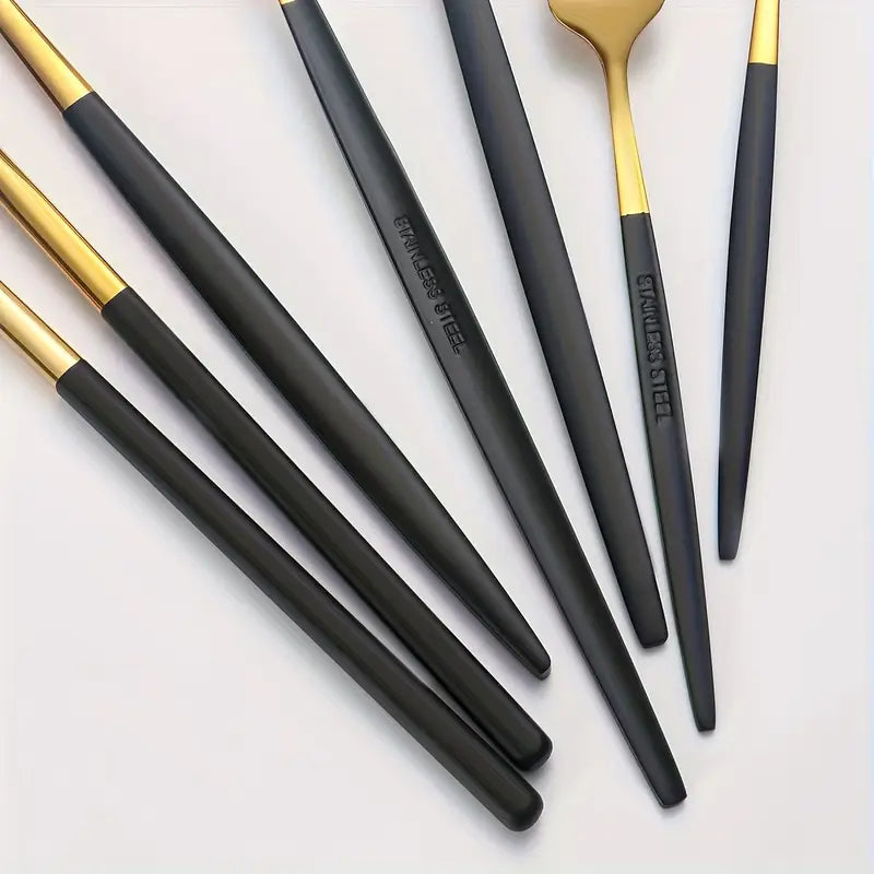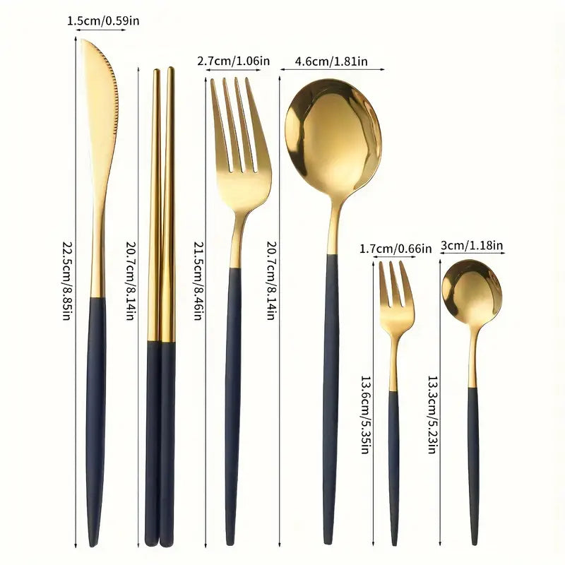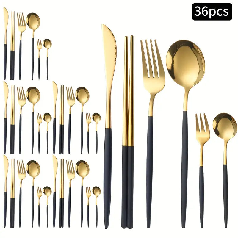 36pcs Elegant Stainless Steel Cutlery Set – Modern Black Handle Flatware with Knives, Forks, Spoons & Chopsticks for Home, Kitchen & Dining