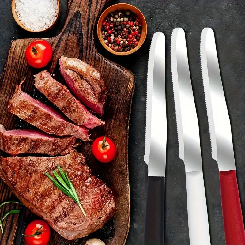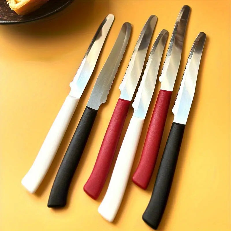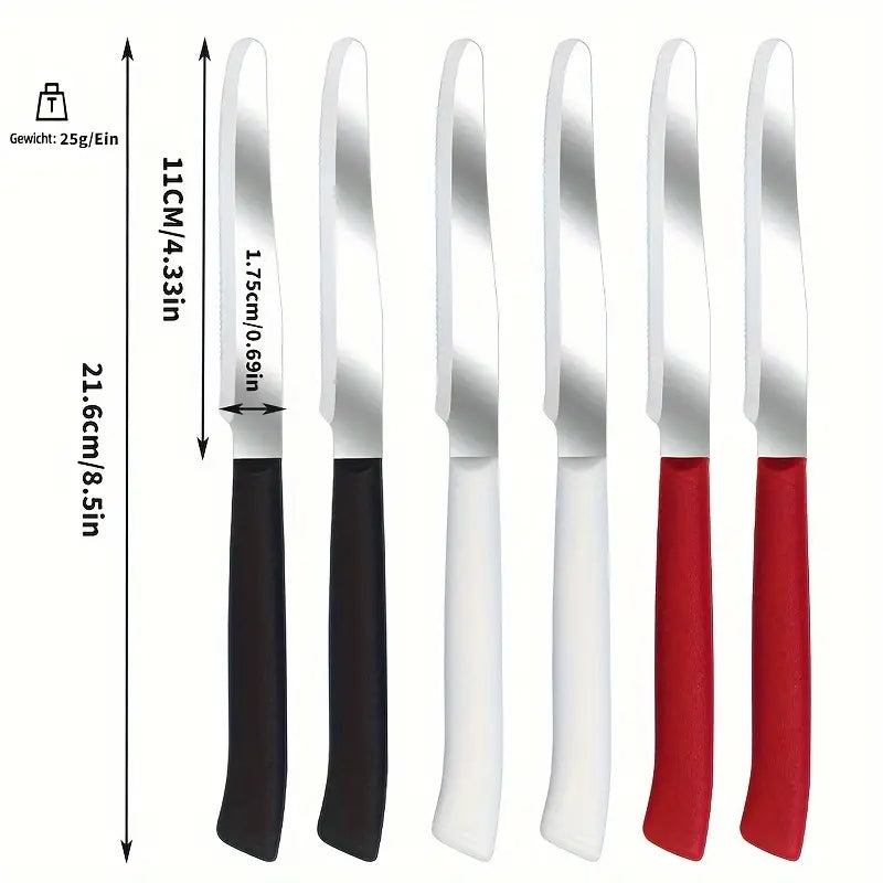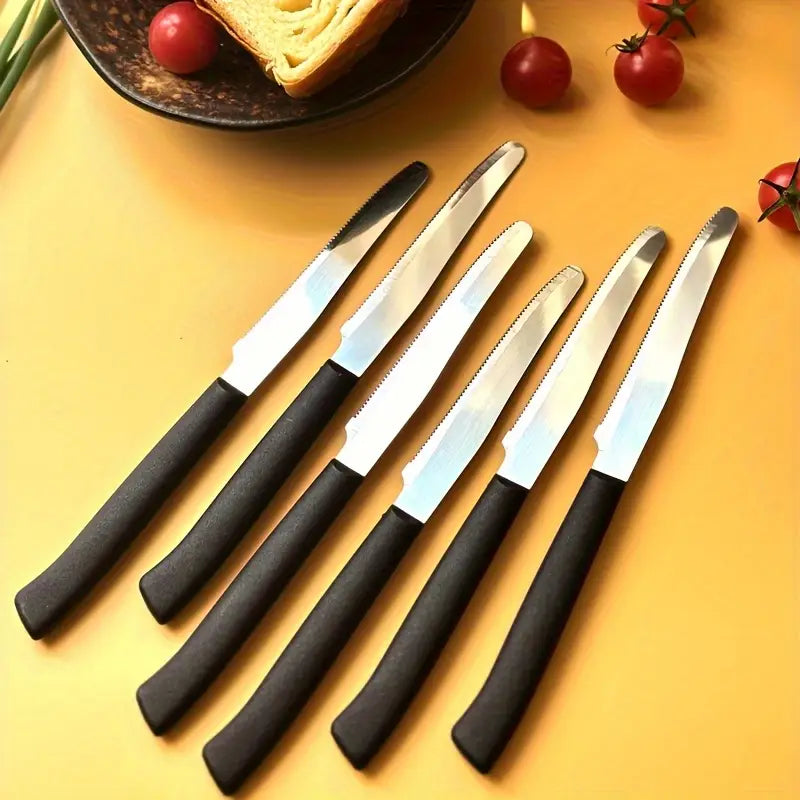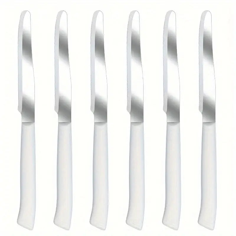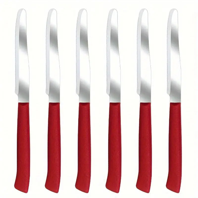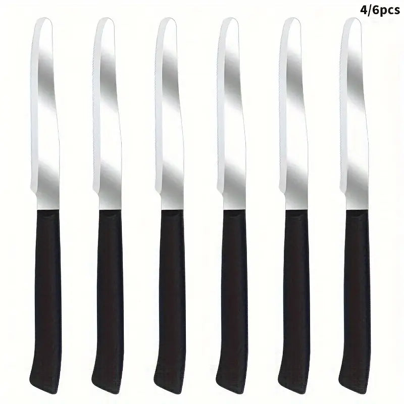 Enhance your dining experience with this 4/6pcs stainless steel knife set, featuring versatile serrated knives ideal for steak, bread, tomato, desserts, and snacks. Perfect for family gatherings, brunches, or everyday meals, each knife offers sharp precision and durability. Designed for comfort and efficiency, these Western-style dining knives are dishwasher safe, making cleanup effortless while adding elegance to your table.
