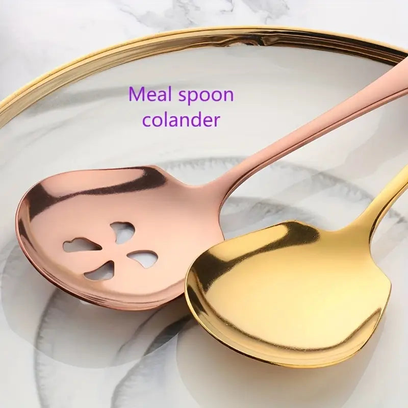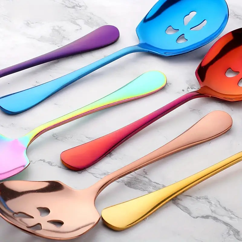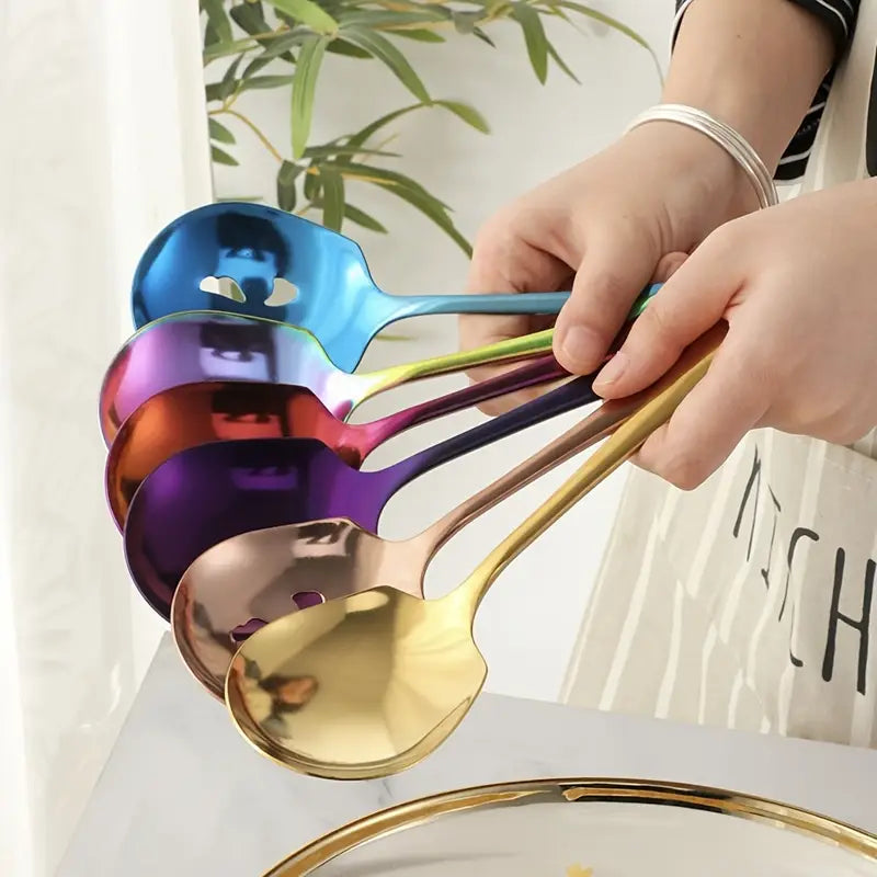 4-Piece Colorful Stainless Steel Tableware Set – Spoon, Strainer, Drain Scoop – Practical & Dishwasher Safe