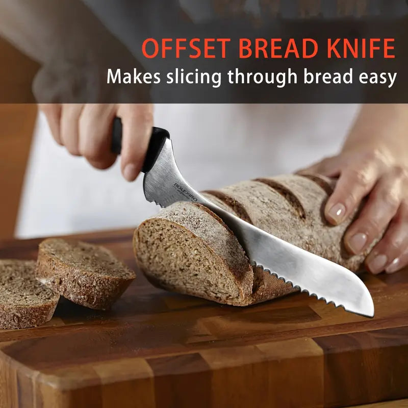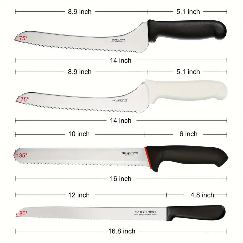 Effortlessly slice through crusty breads, cakes, and more with this 4-piece serrated bread knife set. Includes a 9-inch offset bread knife and 10/12-inch wavy-edge knives, perfect for homemade breads and versatile kitchen use. Ultra-sharp blades ensure clean cuts every time, making baking and serving easier and more efficient.