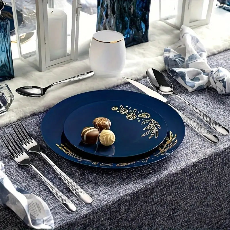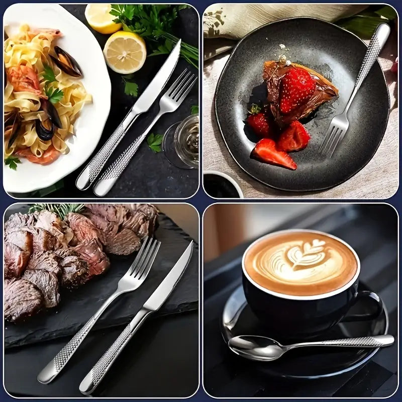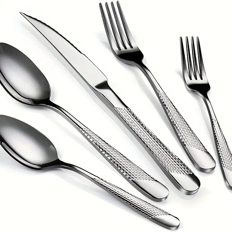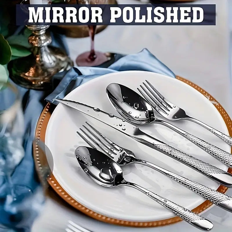 Elevate your dining experience with this 40-piece hammered stainless steel flatware set for 8. Includes dinner knives, forks, and spoons, mirror-polished and dishwasher-safe. Stylish, durable, and perfect for family meals, dinner parties, or gifting. Modern design, premium quality, and versatile for everyday use.