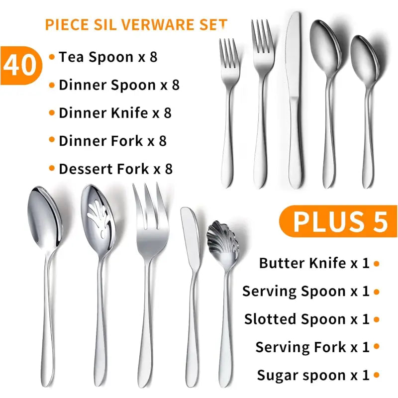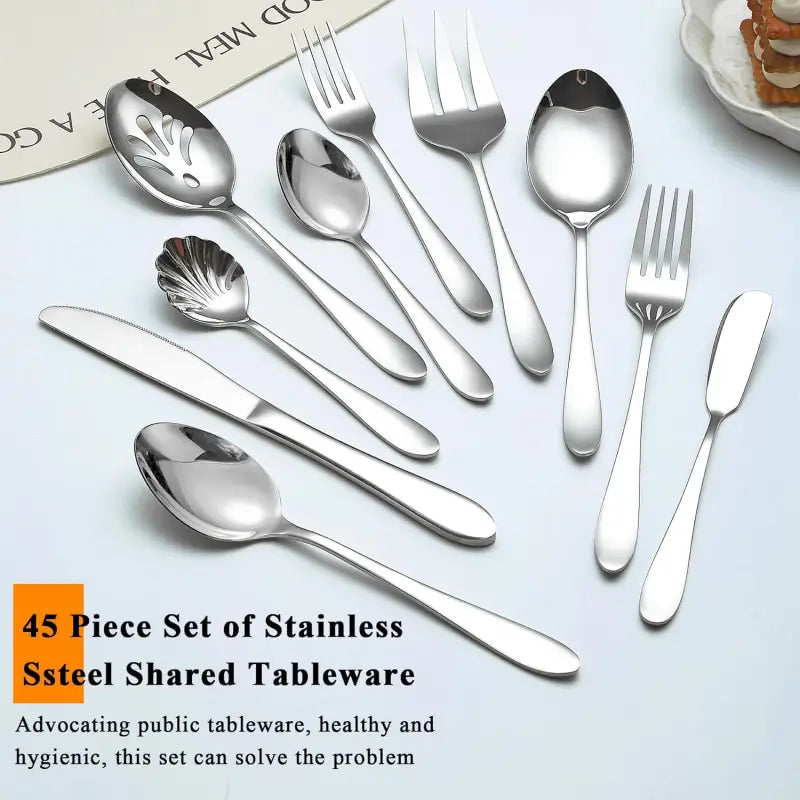 45-Piece Stainless Steel Cutlery Set for 8 - Knife, Fork, Spoon & Serving Utensils - Dishwasher Safe Dining Set for Home & Restaurant