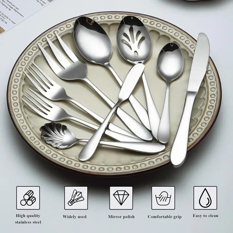 Complete Set for 8 People: Includes dinner knives, forks, spoons, and serving utensils for 8 guests, providing a full dining experience.