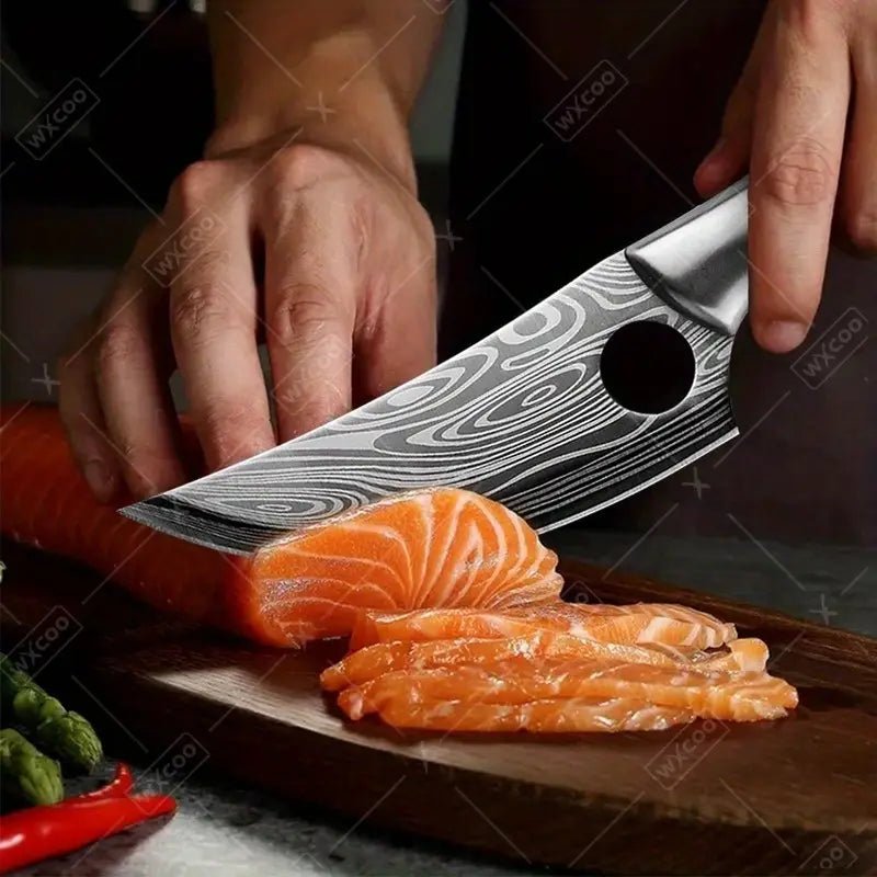 This 5.5-inch hand-forged kitchen knife is the perfect tool for any kitchen, offering versatility for meat slicing, boning, and general butchering tasks. Made from high-quality stainless steel, this Japanese-inspired utility knife combines strength and precision for effortless cutting. Whether you're prepping meats, vegetables, or other ingredients, its durable construction and sharp edge make it an essential piece of kitchenware, designed for both professional chefs and home cooks alike.