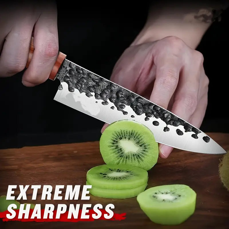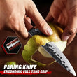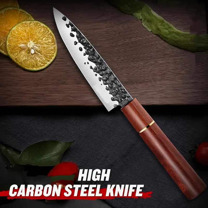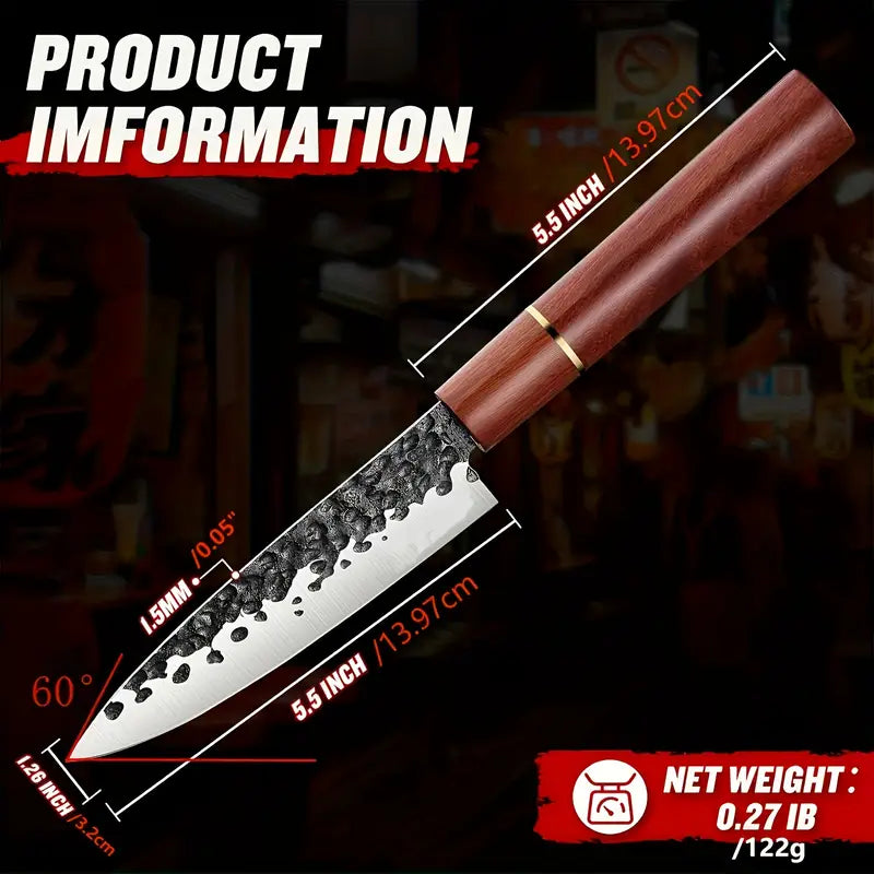 This 5-inch hand-forged Japanese paring knife features a high carbon steel blade with a razor-sharp edge, perfect for precision peeling, slicing fruits, vegetables, and meats. The ergonomic rosewood handle ensures a comfortable grip, while its traditional Japanese design offers both style and durability. An ideal gift for professional chefs, home cooks, and culinary students, this knife combines high-quality craftsmanship with exceptional performance.