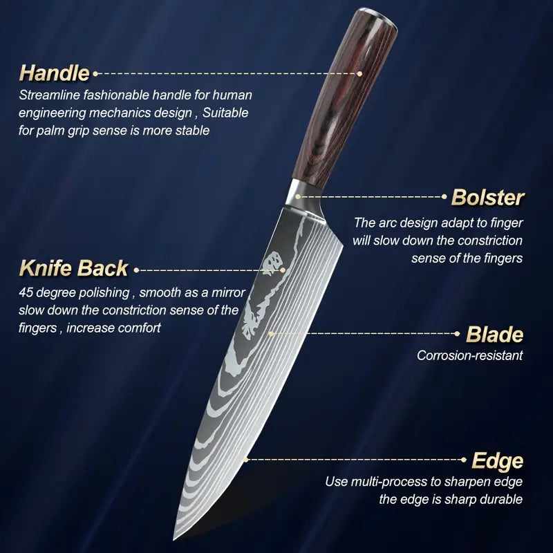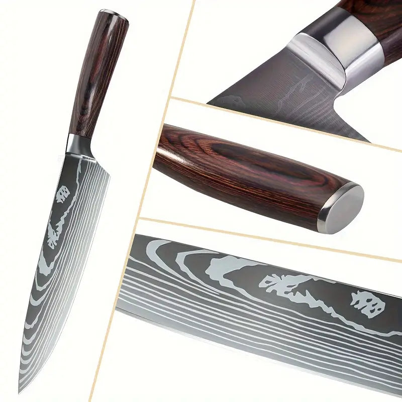 Upgrade your kitchen with this 5-piece professional Japanese kitchen knife set, crafted from premium stainless steel for long-lasting sharpness and precision. The set includes a Santoku knife, paring knife, cleaver, utility knife, boning knife, and butcher’s knife in versatile 5", 7", and 8" sizes, making it perfect for slicing, chopping, dicing, and filleting. Each knife features a balanced ergonomic design for effortless control, whether preparing vegetables, fruits, or meats. Packaged in an elegant gift box, this chef knife set makes an excellent choice for home cooks, professional chefs, and as a thoughtful gift for culinary enthusiasts.