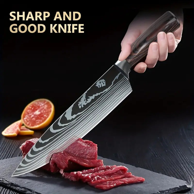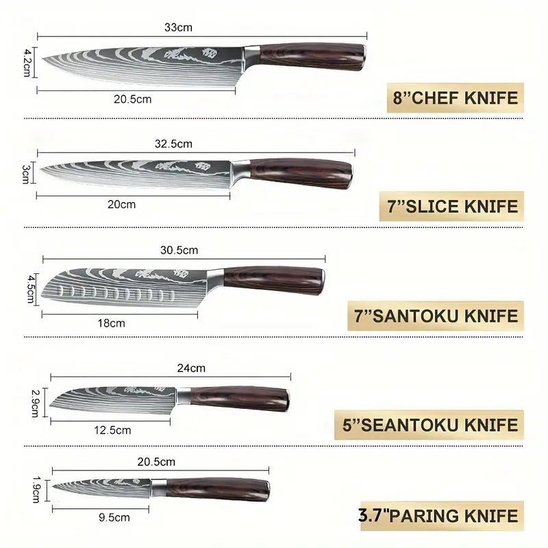 This 5pcs Japanese Kitchen Knife Set features professional-grade stainless steel blades designed for precision and durability. Includes Santoku knife, paring knife, cleaver, utility knife, and boning/butcher knife in 5", 7", and 8" sizes, perfect for slicing, chopping, and dicing all types of food. Ergonomic handles provide comfort during extended use. Comes in an elegant gift box, making it ideal for home chefs, cooking enthusiasts, or as a thoughtful gift for special occasions.