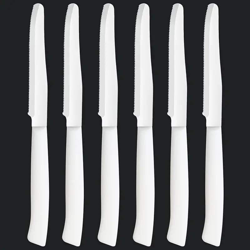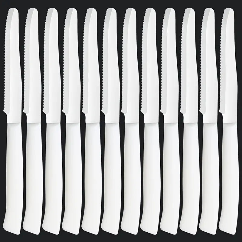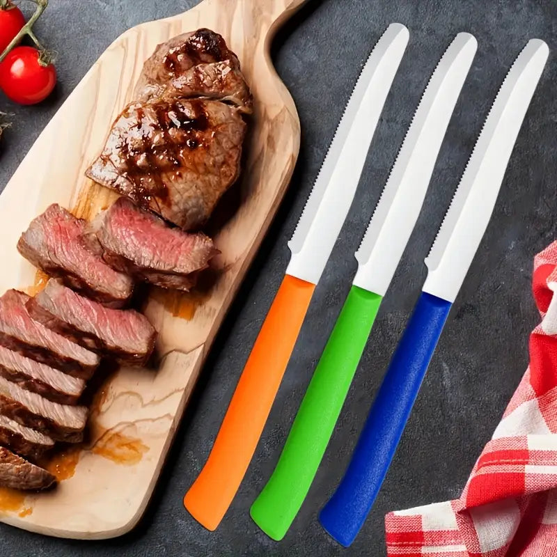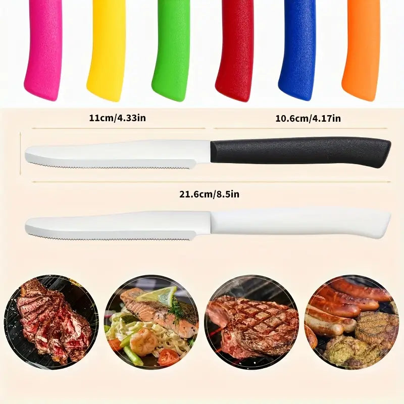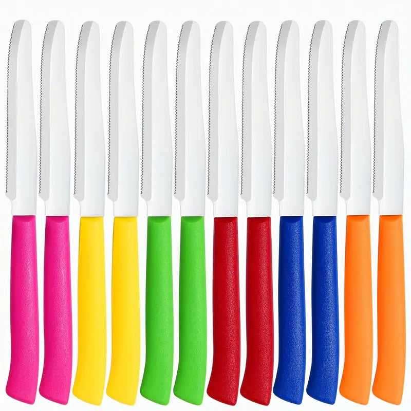 Upgrade your dining and kitchen essentials with this 6/12pcs Multicolor Stainless Steel Steak Knife Set. Featuring sharp serrated edges, these knives are perfect for steak, bread, desserts, and everyday dining. The ergonomic non-slip handles ensure a comfortable grip, while the durable stainless steel blades are rust-resistant and dishwasher safe for easy cleaning. Ideal for outdoor picnics, home cooking, restaurants, and pastry shops, this all-season knife set combines vibrant style with long-lasting functionality.