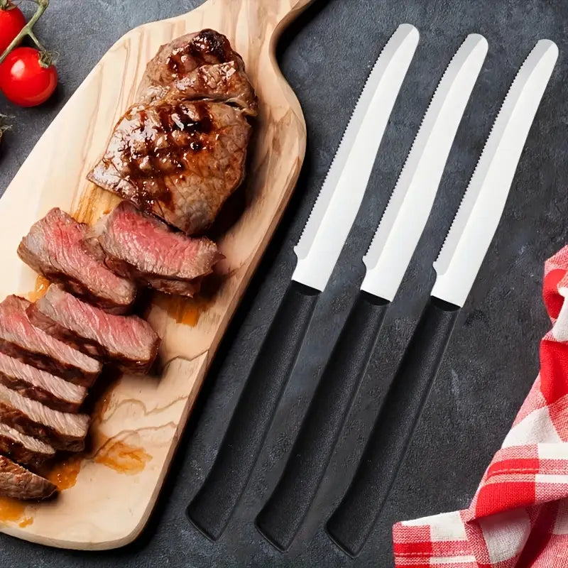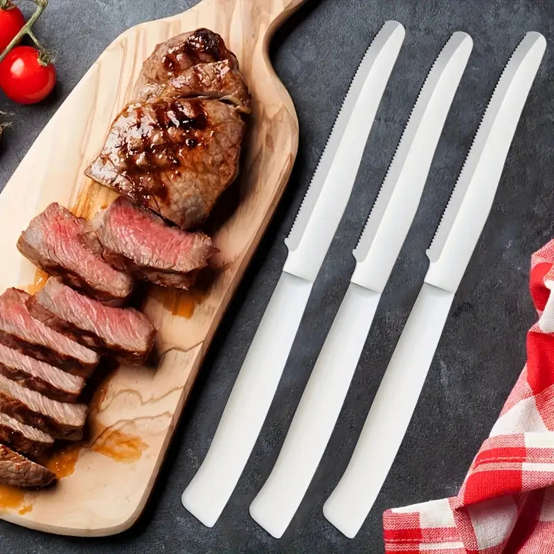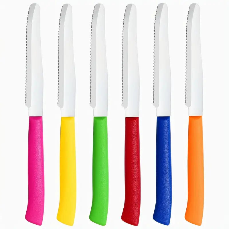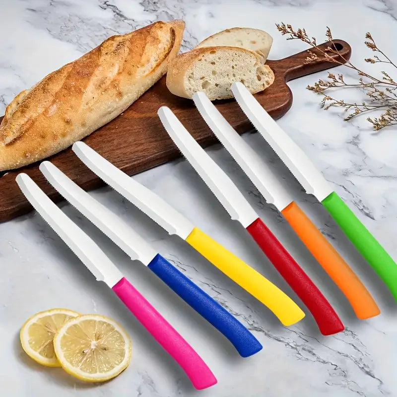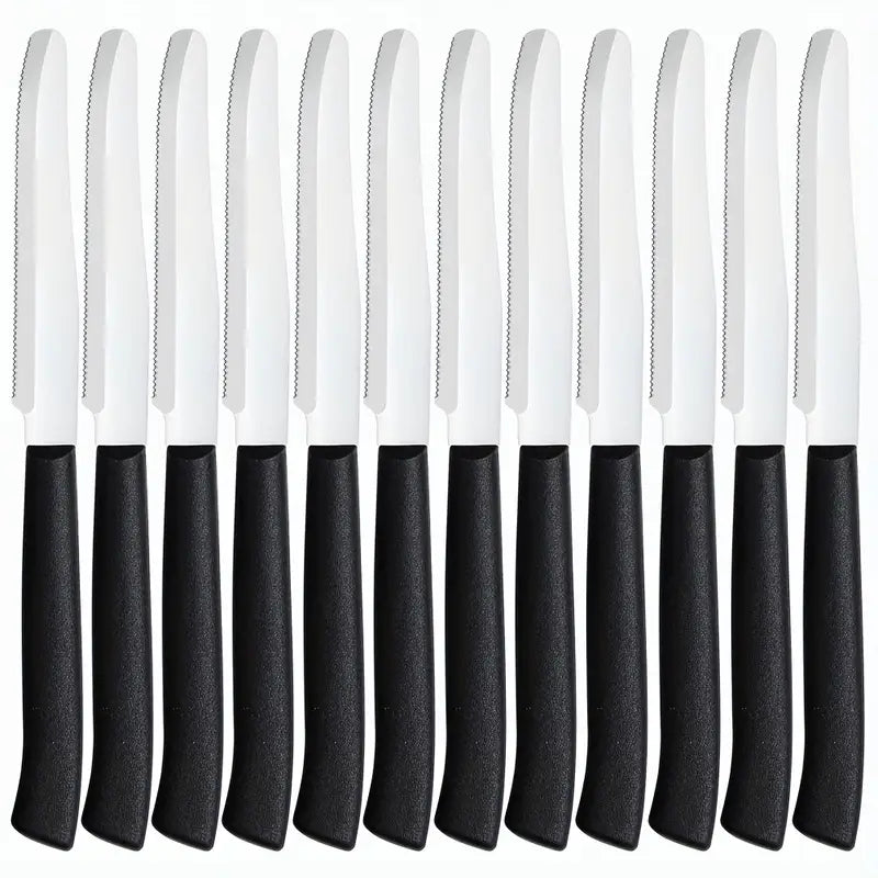 Upgrade your dining and kitchen essentials with this 6/12pcs Multicolor Stainless Steel Steak Knife Set. Featuring sharp serrated edges, these knives are perfect for steak, bread, desserts, and everyday dining. The ergonomic non-slip handles ensure a comfortable grip, while the durable stainless steel blades are rust-resistant and dishwasher safe for easy cleaning. Ideal for outdoor picnics, home cooking, restaurants, and pastry shops, this all-season knife set combines vibrant style with long-lasting functionality.