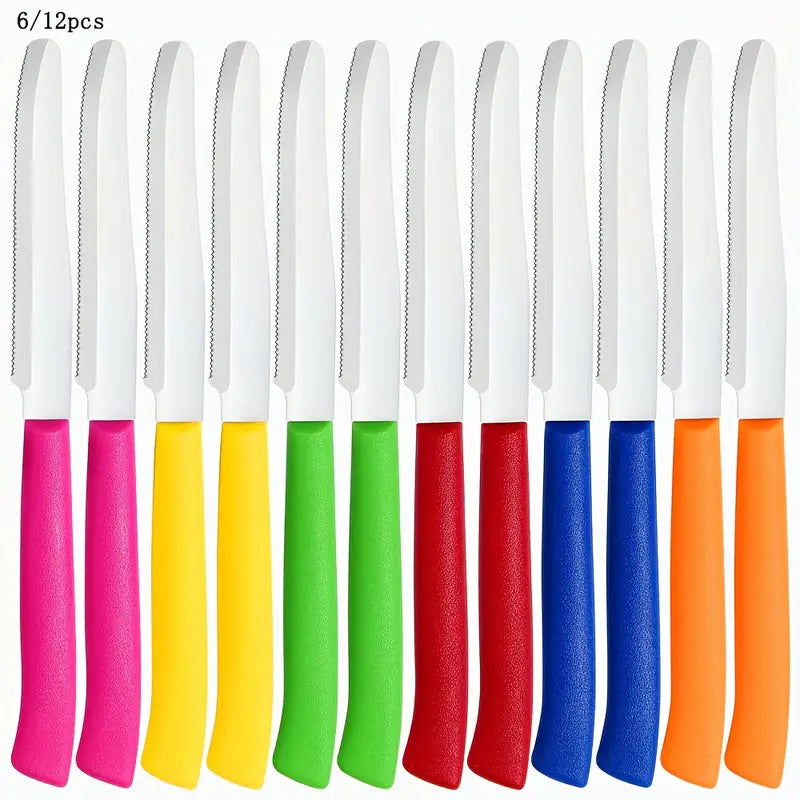 6/12pcs Multicolor Stainless Steel Steak Knife Set – Serrated Dinner, Bread & Dessert Knives with Non-Slip Handles, Dishwasher Safe for Home, Restaurant & Outdoor Use