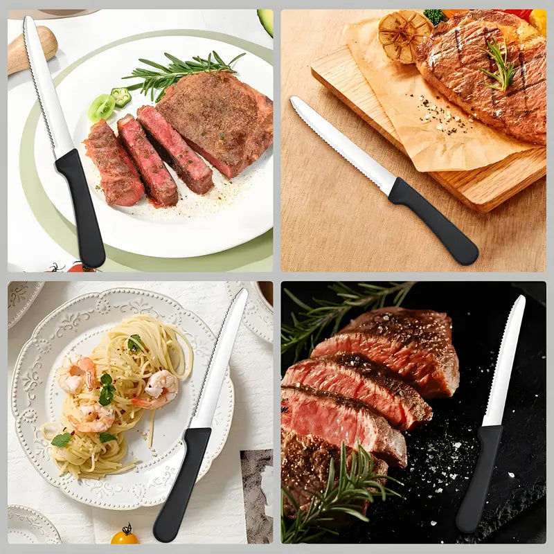 This 6- or 12-piece stainless steel steak and tomato knife set features premium blades designed for sharpness, durability, and precise slicing of meat, vegetables, fruits, and bread. Perfect for home kitchens, restaurants, hotels, and outdoor picnics, these reusable knives are dishwasher safe for easy cleaning. Combining functionality, long-lasting performance, and versatile use, this set is an essential addition to any dining table or culinary setup.