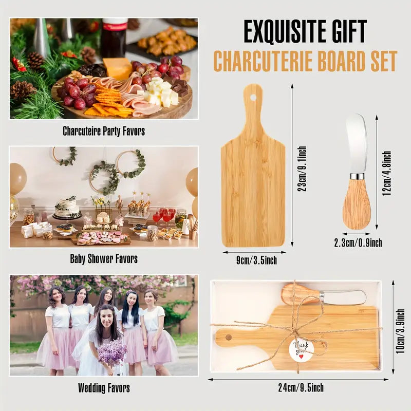 This set includes 6 mini bamboo cheese boards and spreader knives, perfect for serving a variety of cheeses and appetizers. Ideal for Christmas, weddings, bridal showers, birthdays, or any special occasion, each board comes with a gift box, making it a thoughtful and stylish gift. These compact, versatile boards are perfect for creating elegant charcuterie displays and adding a touch of sophistication to your gatherings.