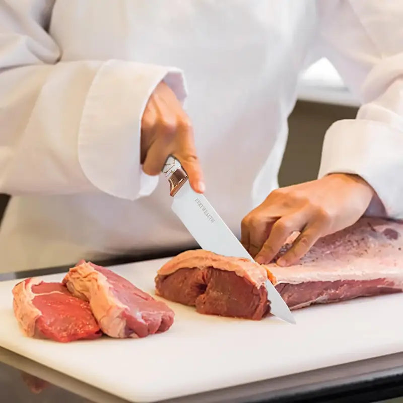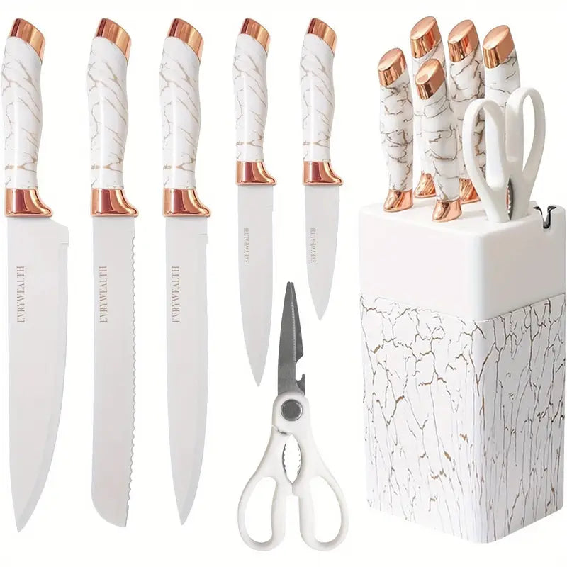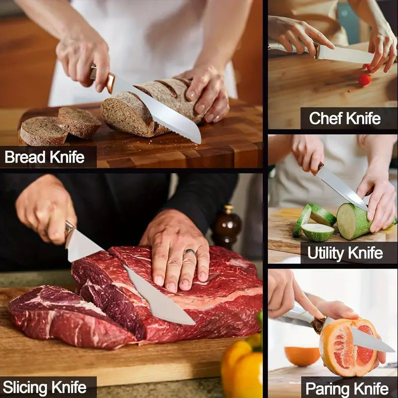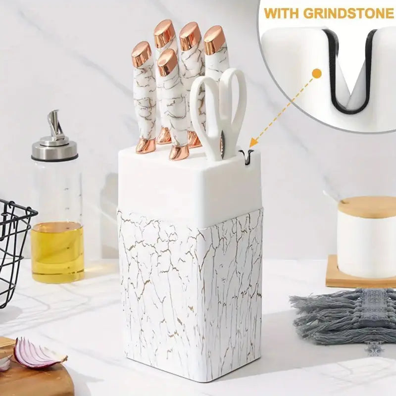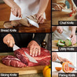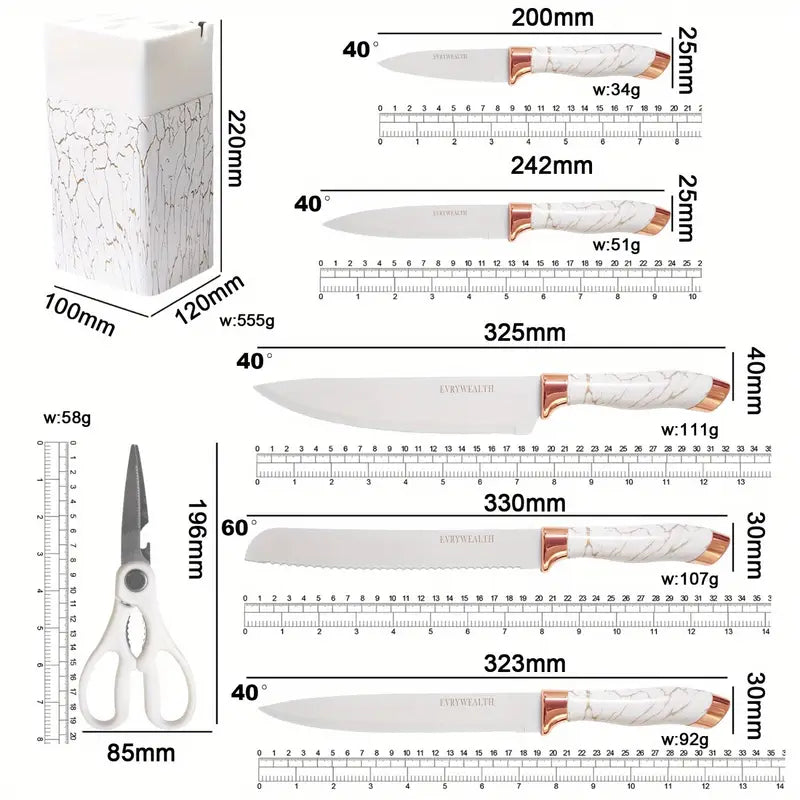 Upgrade your kitchen with this 6-piece knife set, featuring a chef knife, bread knife, and versatile kitchen scissors, all crafted from durable stainless steel. Perfect for slicing meat, vegetables, fruits, and bread, each knife fits neatly into the included white block for safe and organized storage. Stylish, practical, and built to handle all your everyday cooking needs.