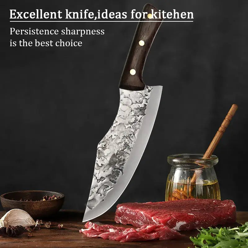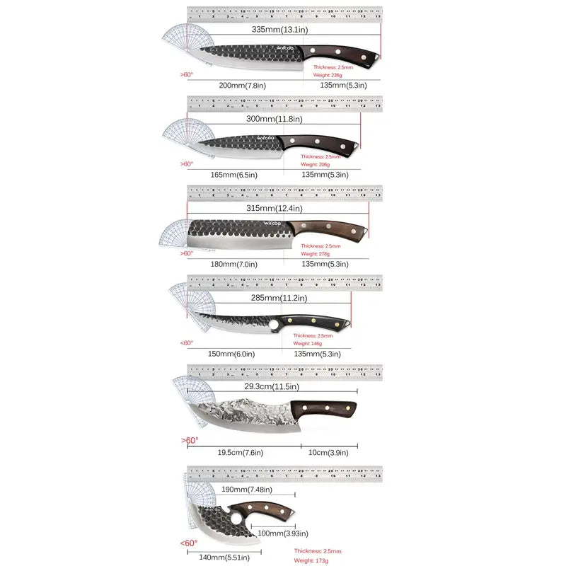 This 6-piece stainless steel knife set includes sharp, high-quality kitchen knives for slicing cheese, pizza, meat, and more. Featuring a meat cleaver, boning knife, and mini knife, each blade is handmade and forged for precision and durability. The set comes with protective covers for safe storage, making it perfect for both professional chefs and home cooks who need versatile and reliable tools in their kitchen.