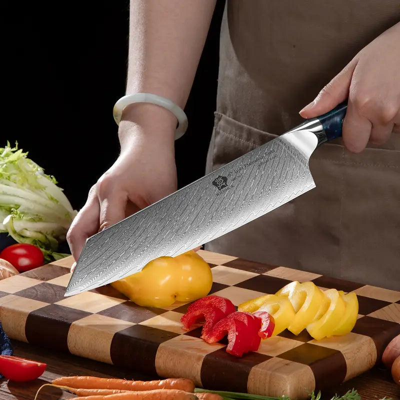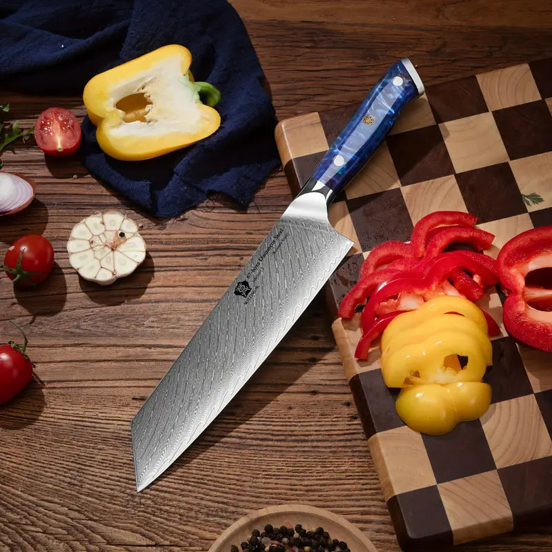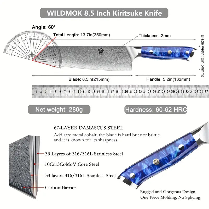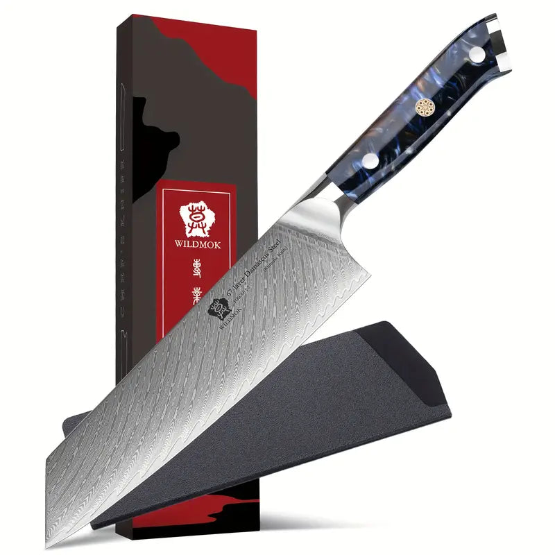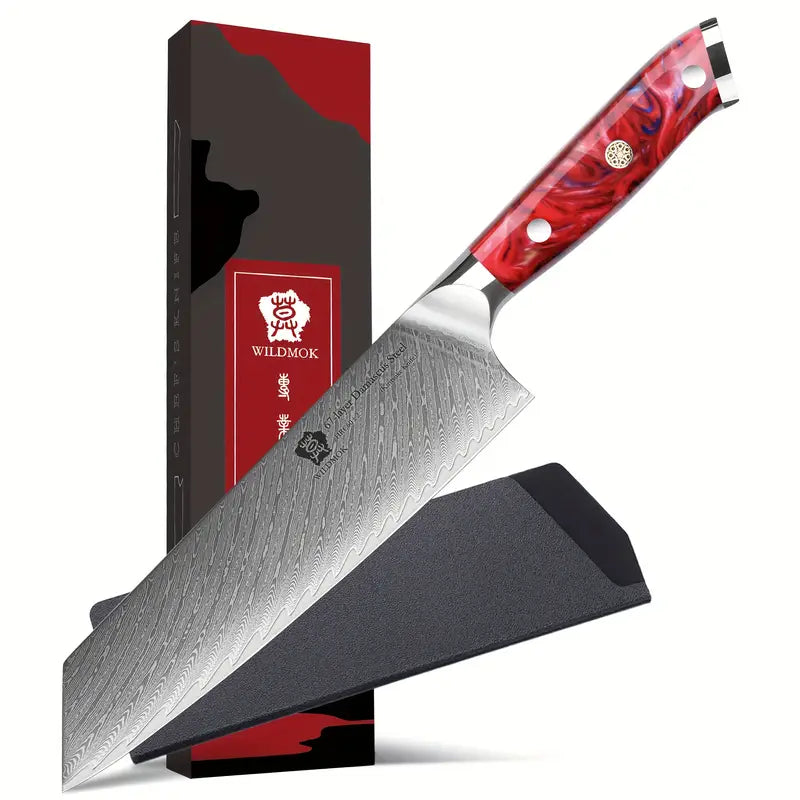 This 67-layer Damascus steel Kiritsuke knife features a razor-sharp Japanese-style blade, perfect for precise slicing and utility tasks. The colorful resin handle provides a comfortable, ergonomic grip, while the exquisite gift box makes it an ideal present for chefs, collectors, and professionals. Combining style and functionality, this knife is a must-have for any culinary enthusiast.