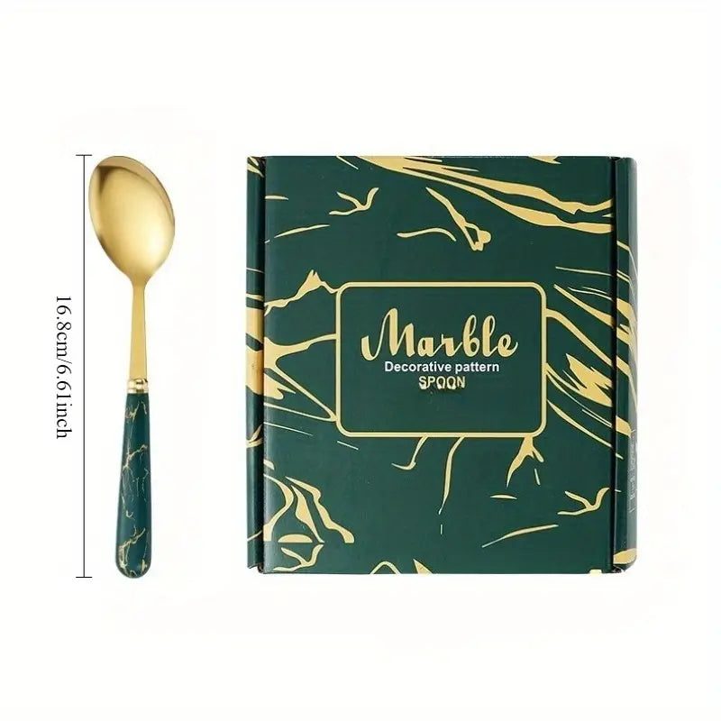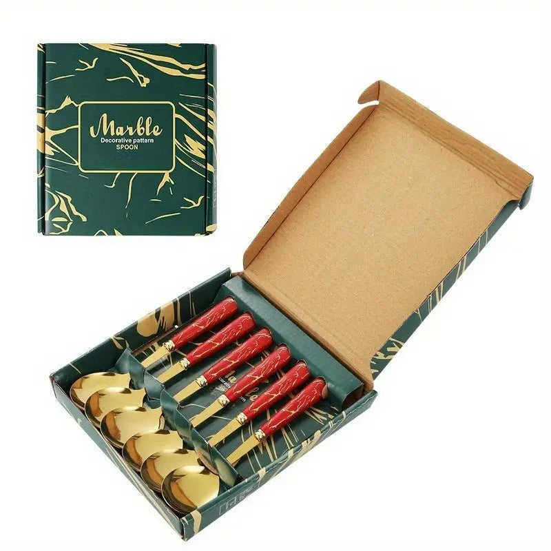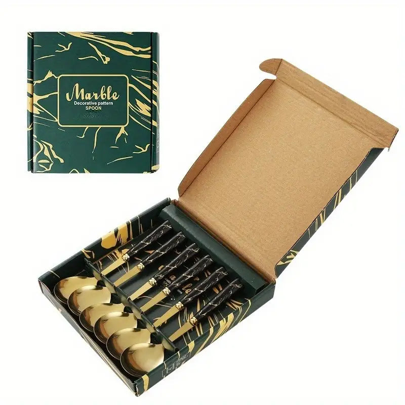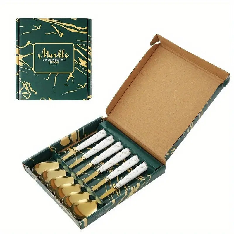 6pcs Stainless Steel Spoon Set with Marble Pattern & Porcelain Handle – Elegant Household Dining Spoons, Long Handle Korean Style – Gift Box Set