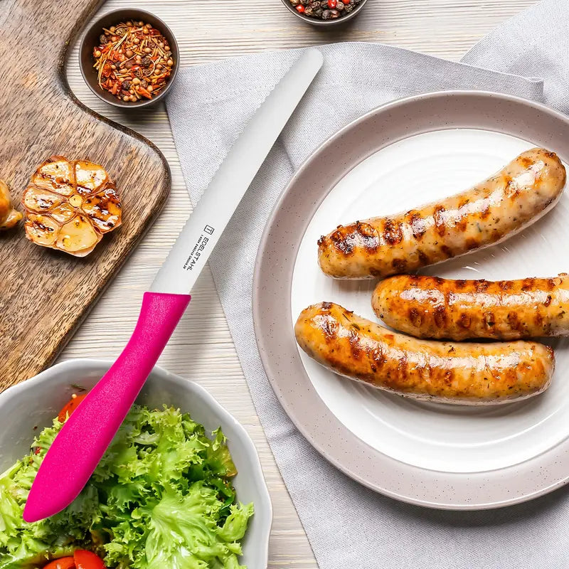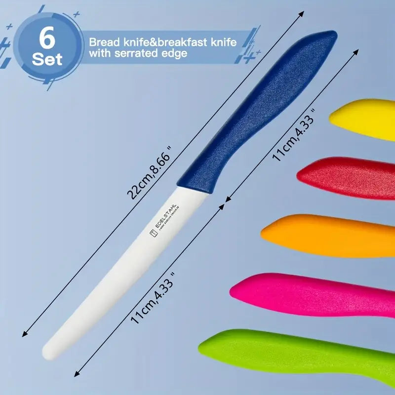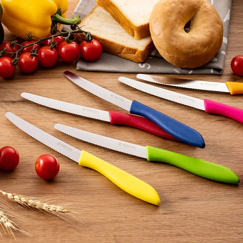 This 6-piece steak knife set is crafted from premium stainless steel with razor-sharp serrated edges, making it perfect for cutting steak, tomatoes, bread, and more. Featuring durable construction and vibrant colorful handles, these knives are both stylish and functional for everyday dining. Easy to clean and dishwasher safe, they are a versatile addition to any kitchen, ideal for family meals, entertaining guests, or restaurant use.