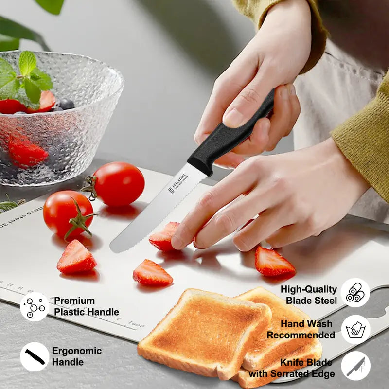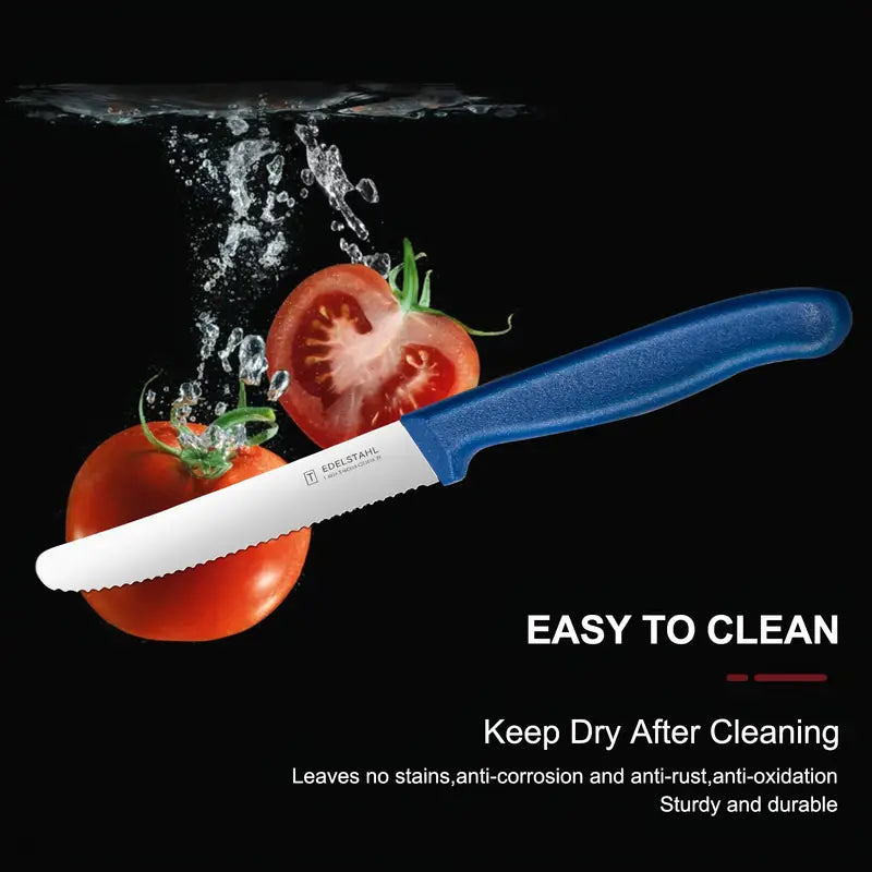 This 6-piece tomato and snack knife set features high-quality stainless steel blades with a sharp, corrugated edge for effortless cutting of tomatoes, bread, fruits, and vegetables. Durable and dishwasher safe, these breakfast knives combine practicality with style, making them ideal for everyday kitchen use. Perfect for home dining, picnics, or casual meals, they provide precision, comfort, and reliability in every slice.